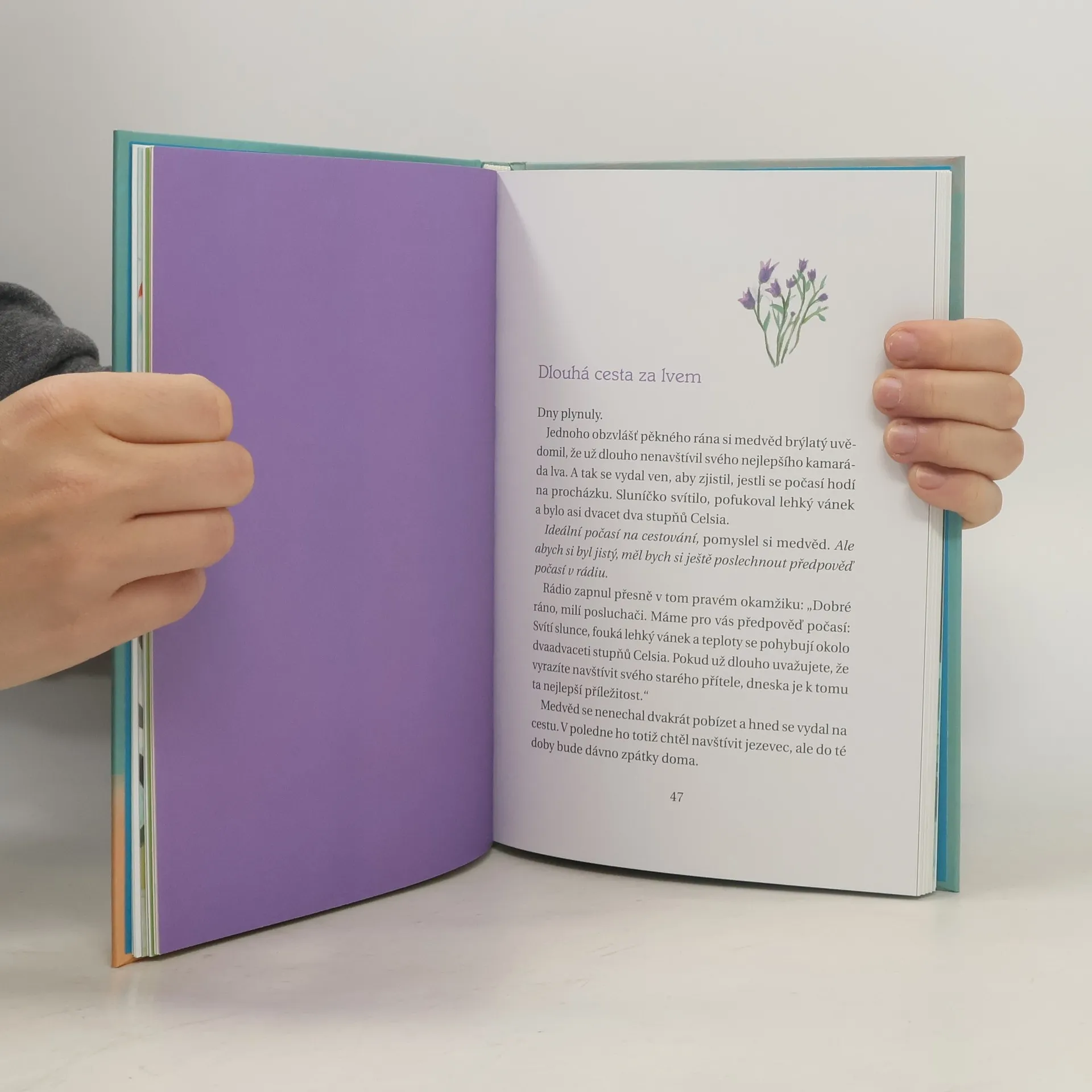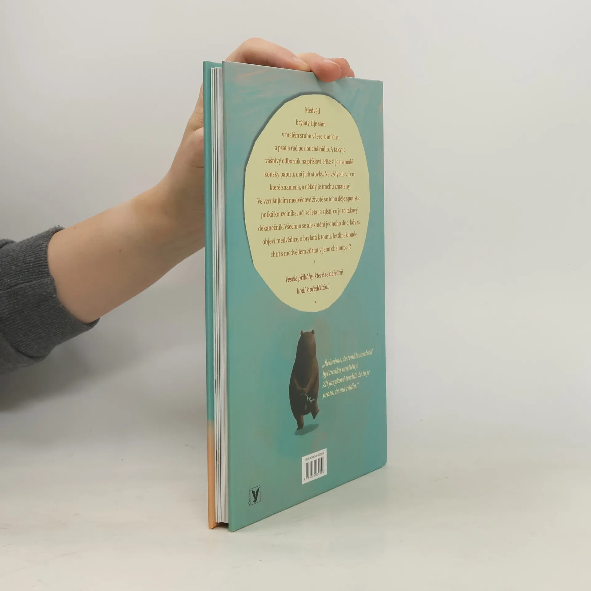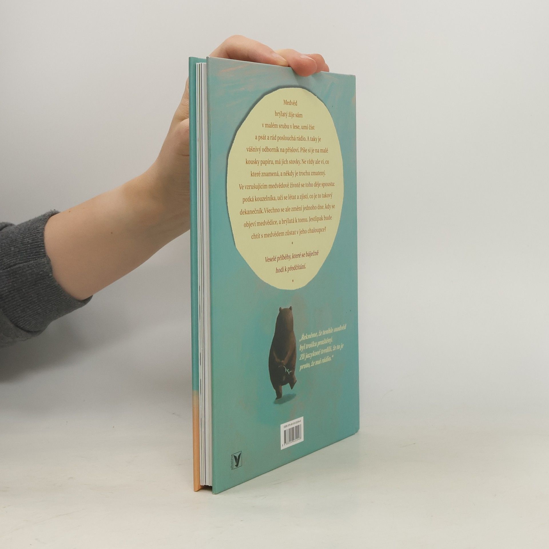 Medvěd brýlatý žije sám v malém srubu v lese, umí číst a psát a rád poslouchá rádio. A taky je vášnivý odborník na přísloví. Píše si je na malé kousky papíru, má jich stovky. Ne vždy ale ví, co které znamená, a někdy je trochu zmatený. Ale co na tom záleží, věty jako „Jablko nechodí po horách, ale po lidech“ zní přece skvěle! Ve vzrušujícím medvědově životě se toho děje spousta: potká kouzelníka, učí se létat a zjistí, co je to takový dekanečník. Všechno se ale změní jednoho dne, kdy se objeví medvědice, a brýlatá k tomu. Jestlipak bude chtít s medvědem zůstat v jeho chaloupce?
