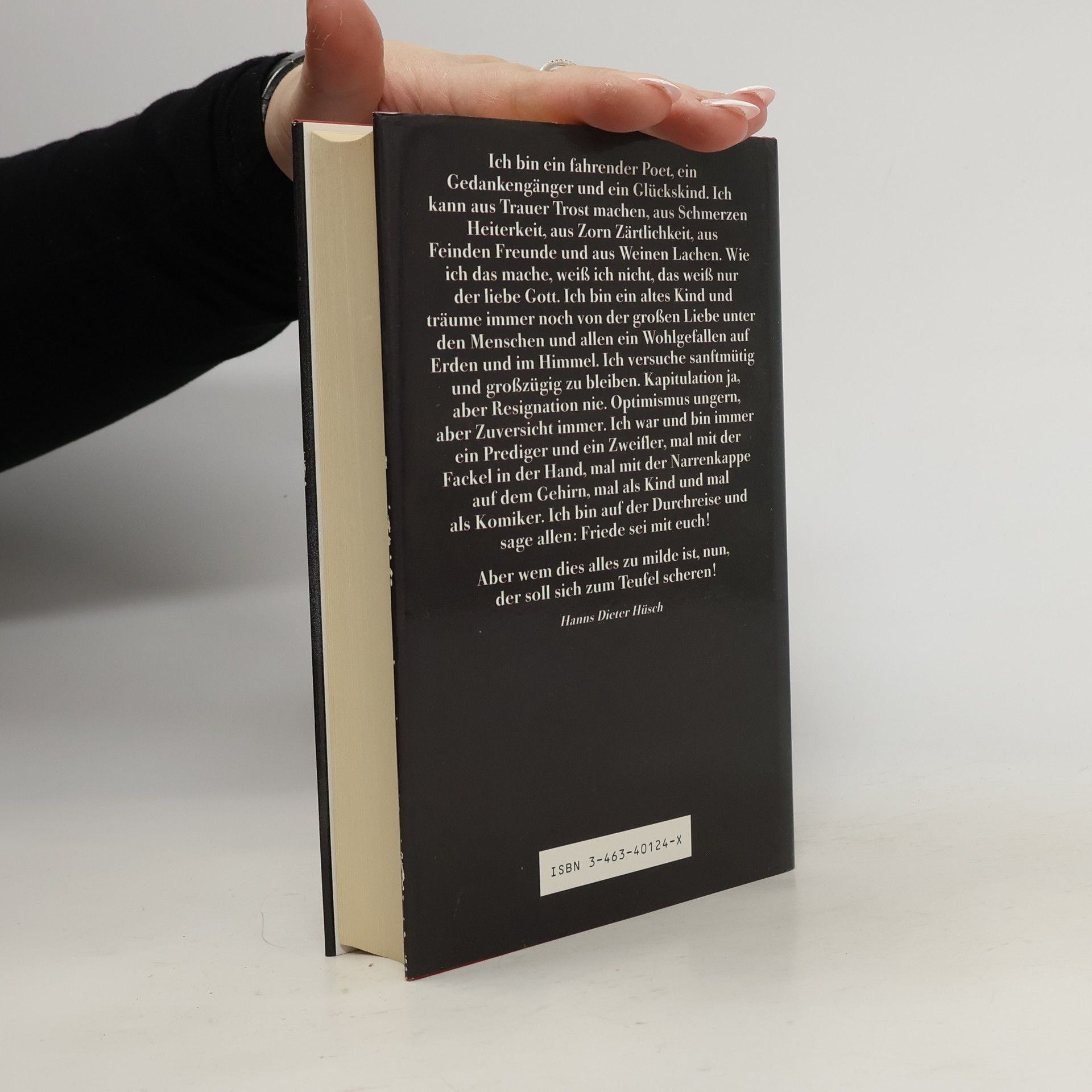 Hanns Dieter Hüsch wurde am 6. Mai 1925 in Moers geboren. Nach kurzem Studium, erst der Medizin, dann der Theaterwissenschaft und Literaturgeschichte, wurde er 1947 Kabarettist, anfänglich mit Soloprogrammen, von 1956 bis 1962 im Ensemble »Arche Nova«, danach hauptsächlich wieder Soloprogramme. Verleihung des Deutschen Kleinkunstpreises, der Ehrenbürgerwürde der Johannes-Gutenberg-Universität, Mainz, und der Gutenberg-Plakette der Stadt Mainz. Hanns Dieter Hüsch starb am 6. Dezember 2005 in Werfen.