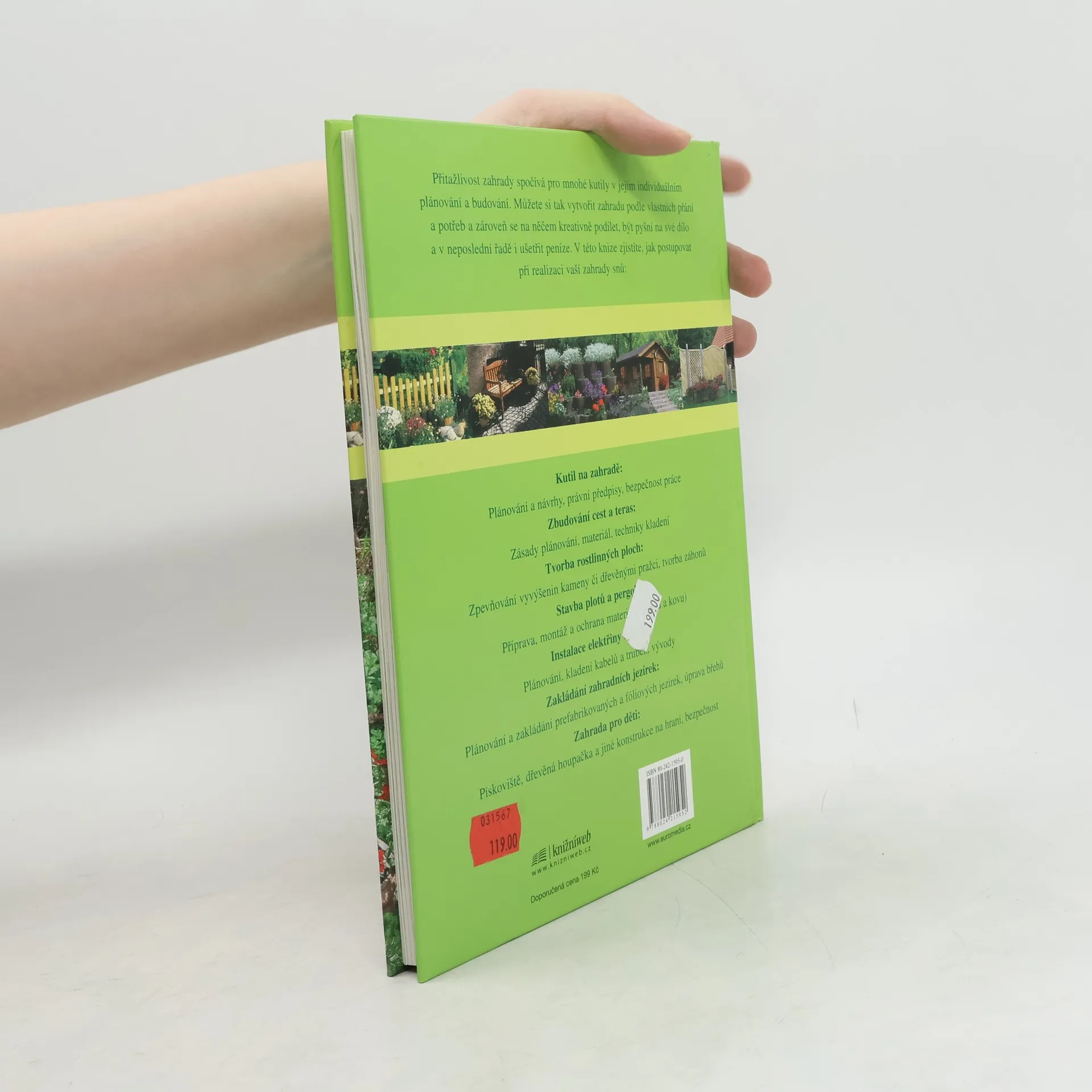 Udělej si sám v zahradě Plánování, stavba, využívání Přitažlivost zahrady spočívá pro mnohé kutily v jejím individuálním plánování a budování. Můžete si tak vytvořit zahradu podle vlastních přání a potřeb a zároveň se na něčem kreativně podílet, být pyšní na své dílo a v neposlední řadě i ušetřit peníze. V této knize zjistíte, jak postupovat při realizaci zahrady snů. Kutil na zahradě: Plánování a návrhy, právní předpisy, bezpečnost práce Zbudování cest a teras: Zásady plánování, materiál, techniky kladení Tvorba rostlinných ploch: Zpevňování vyvýšenin kameny či dřevěnými pražci, tvorba záhonů Stavba plotů a pergol: Příprava, montáž a ochrana materiálu (dřeva a kovu) Instalace elektřiny a vody: Plánování, kladení kabelů a trubek, vývody Zakládán zahradních jezírek: Plánování a zakládání prefabrikovaných a fóliových jezírek, úprava břehů Zahrada pro děti: Pískoviště, dřevěná houpačka a jiné konstrukce na hraní, bezpečnost Váz., 96 stran Cena v KK 179 Kč, běžná cena 199 Kč