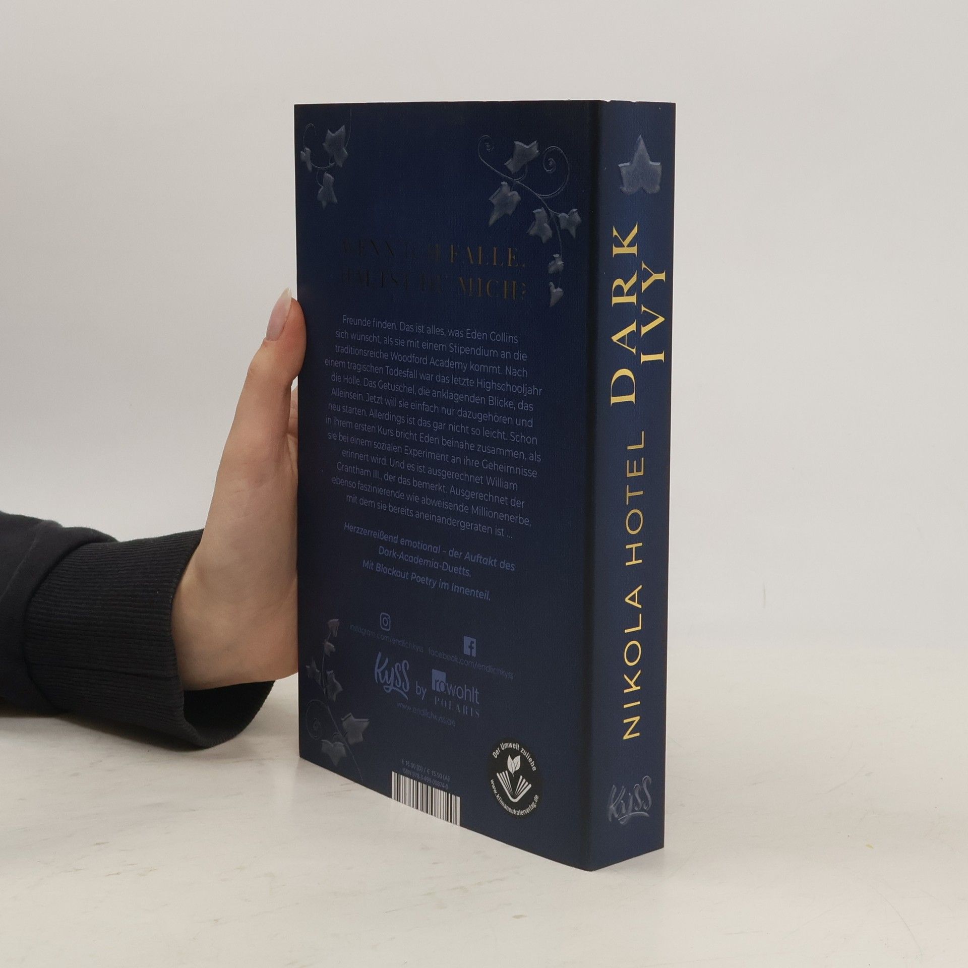 Wenn ich falle, hältst du mich? Der Auftakt zum Dark-Academia-Duett von Spiegel-Bestseller-Autorin Nikola Hotel. Freunde finden. Das ist alles, was Eden Collins sich wünscht, als sie mit einem Stipendium an die traditionsreiche Woodford Academy kommt. Nach einem tragischen Todesfall war das letzte Highschooljahr die Hölle. Das Getuschel, die anklagenden Blicke, das Alleinsein. Jetzt will sie einfach nur dazugehören und neu starten. Allerdings ist das gar nicht so leicht. Schon in ihrem ersten Kurs bricht Eden beinahe zusammen, als sie bei einem sozialen Experiment an ihre Geheimnisse erinnert wird. Und es ist ausgerechnet William Grantham III., der das bemerkt. Ausgerechnet der ebenso faszinierende wie abweisende Millionenerbe, mit dem sie bereits aneinandergeraten ist … Herzzerreißend emotional – für alle Fans von mitreißenden Liebesromanen und Dark Academia. Mit Blackout Poetry im Innenteil.