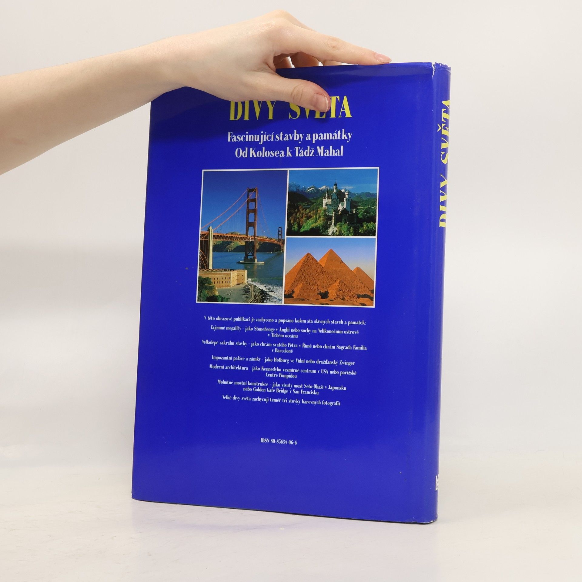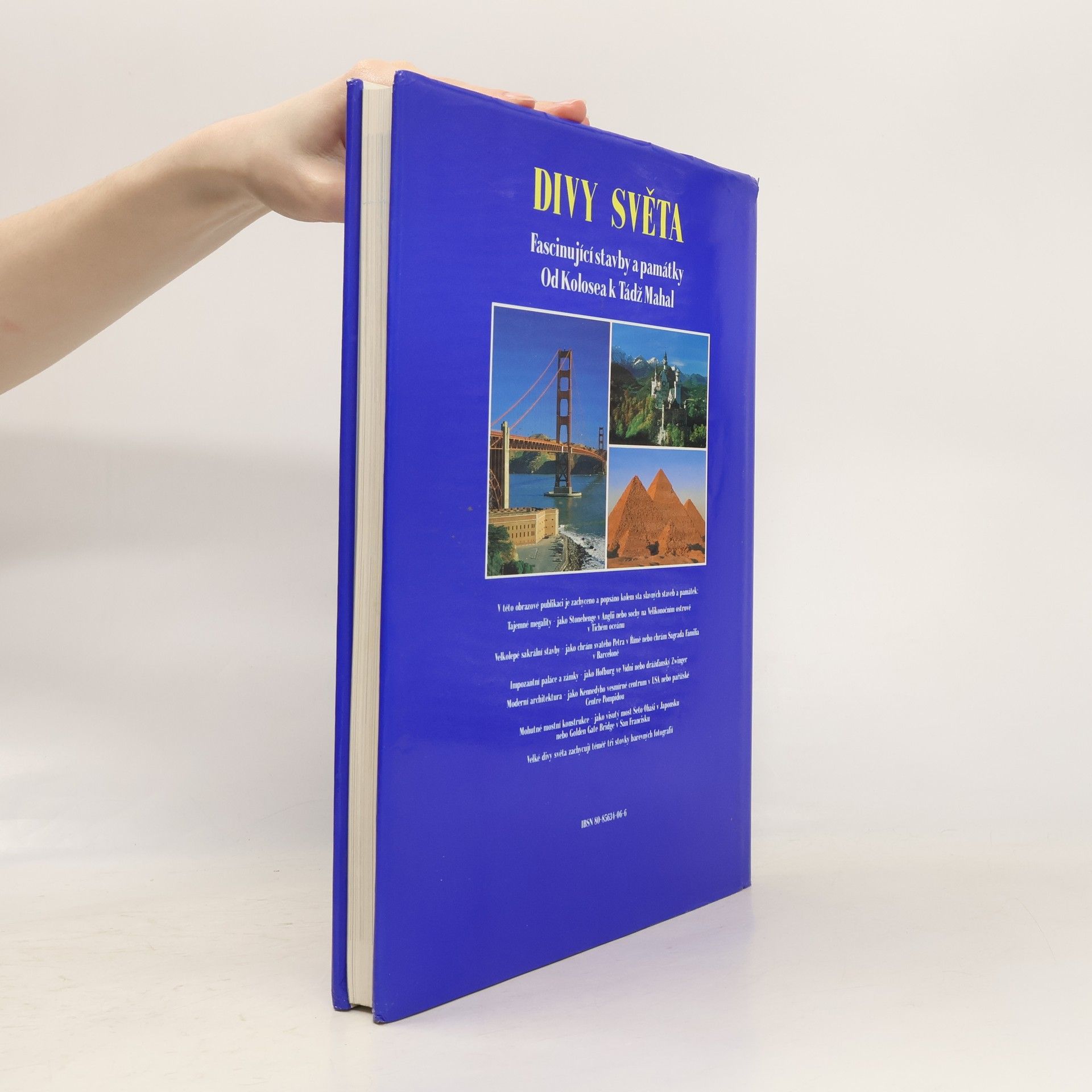 Tato obrazová publikace předvádí na stovku pozoruhodných a facsinujících staveb v rozmezí deseti tisíc let. Spektrum je široké, chrámy kostely, paláce a zámky, ale i ulice plné vody, přehrady, železnice a samozřejmě i věže a mrakodrapy našeho století. Publikace je rozdělena podle světadílů, stati udávají jednotlivé tematické okruhy jako například kostely skouží fundované historické informaci a usnadňuje přehled. Každé stabě je věnována jedna dvojstrana. Fascinující obrazy - kolem tři set dokonalých barevných fotografií - předvádějí velké divy tohoto světa.