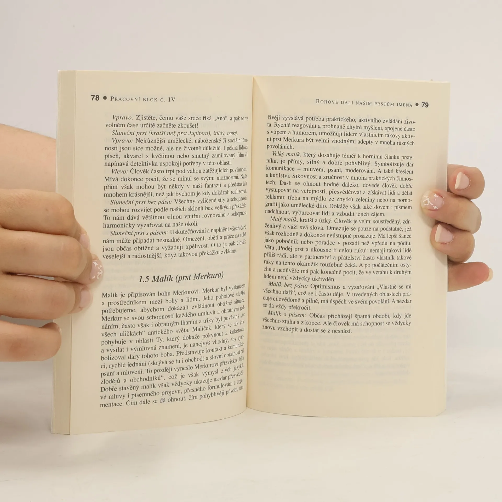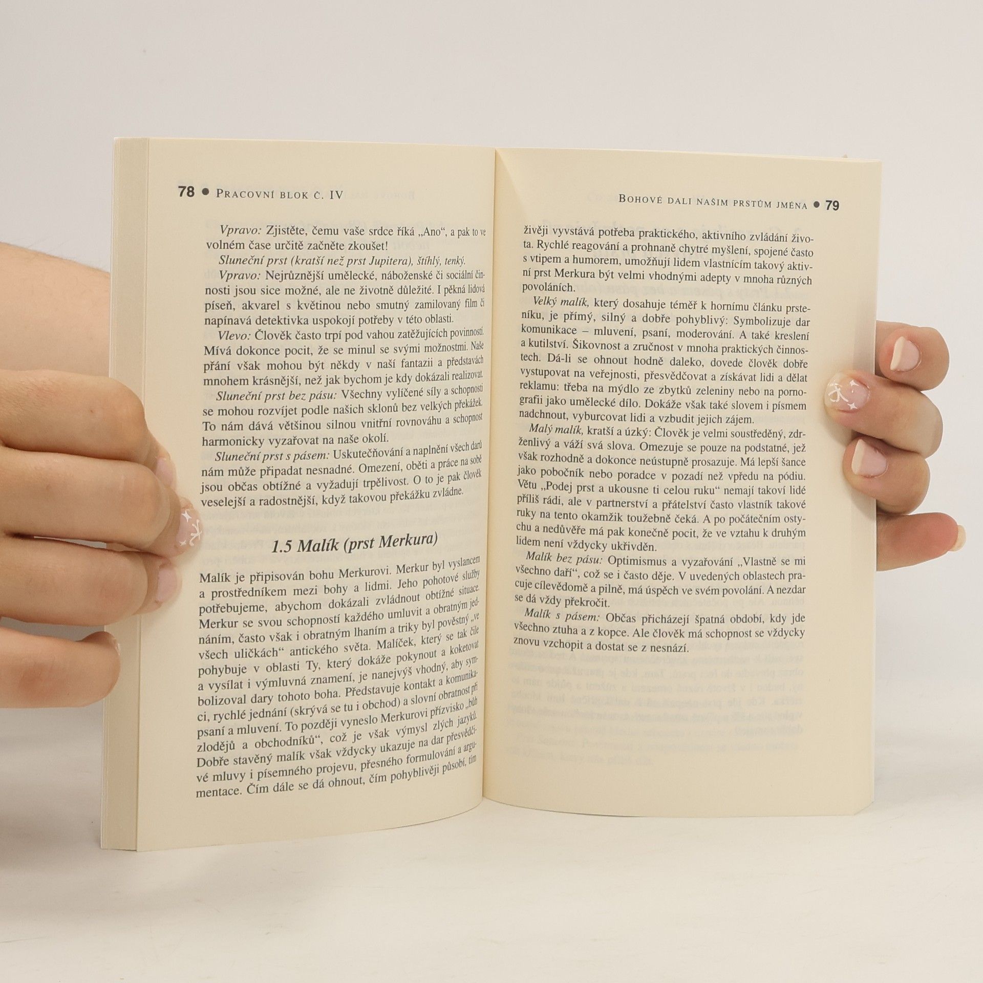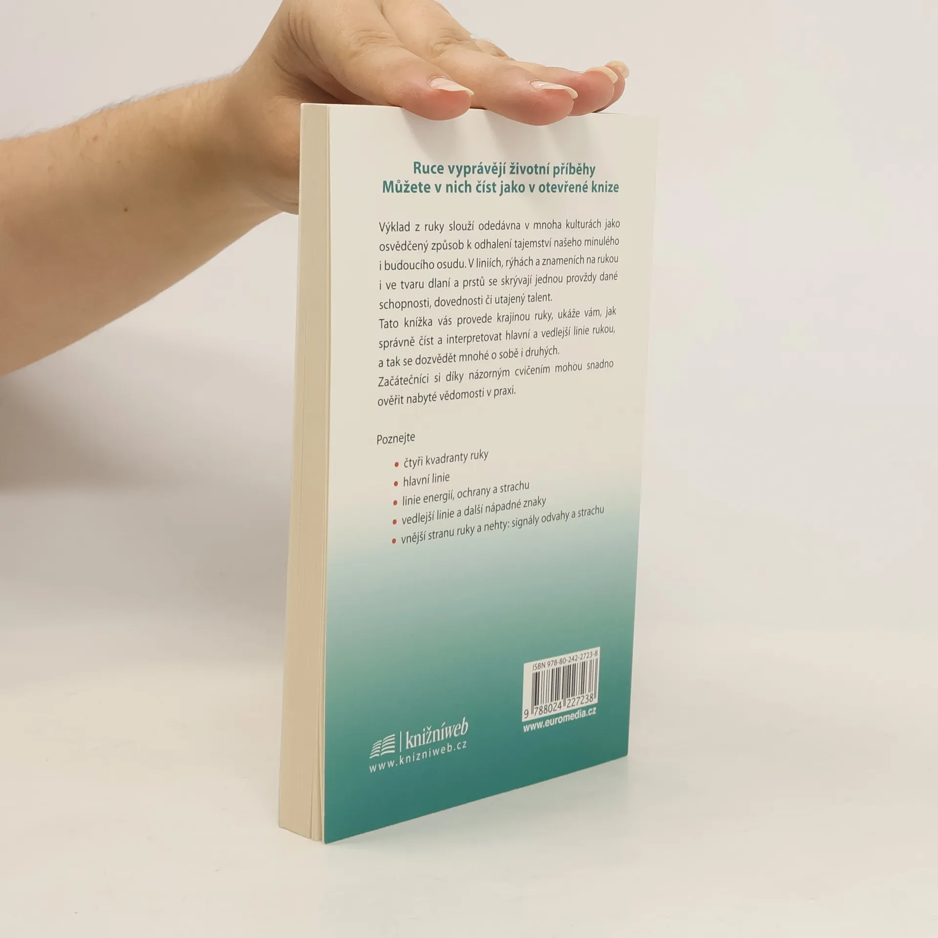 Ruce vyprávějí životní příběhy. Můžete v nich číst jako v otevřené knize. Výklad z ruky slouží odedávna v mnoha kulturách jako osvědčený způsob k odhalení tajemství našeho minulého i budoucího osudu. V liniích, rýhách a znameních na rukou i ve tvaru dlaní a prstů se skrývají jednou provždy dané schopnosti, dovednosti či utajený talent. Tato knížka vás provede krajinou ruky, ukáže vám, jak správně číst a interpretovat hlavní a vedlejší linie rukou, a tak se dozvědět mnohé o sobě i druhých. Začátečníci si díky názorným cvičením mohou snadno ověřit nabyté vědomosti v praxi. Poznejte - čtyři kvadranty ruky - hlavní linie - linie energií, ochrany a strachu - vedlejší linie a další nápadné znaky - vnější stranu ruky a nehty: signály odvahy a strachu.