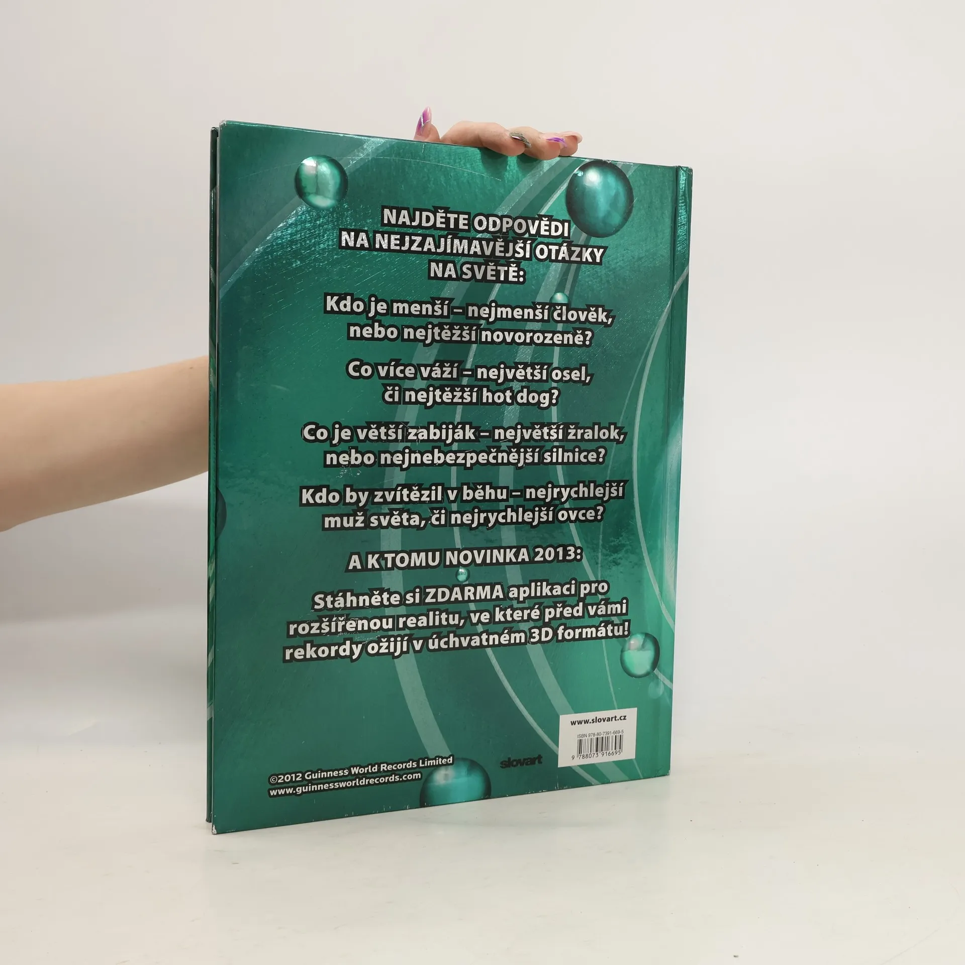 V letošním vydání přináší i odpovědi na otázky: Kdo je menší - nejmenší člověk, nebo nejtěžší novorozeně? Co více váží - největší osel, či nejtěžší hot dog? Co je větší zabiják - největší žralok, nebo nejnebezpečnější silnice? Kdo by zvítězil v běhu - nejrychlejší muž světa, či nejrychlejší ovce? Guinnessova kniha rekordů pro rok 2013 obsahuje zcela nové a nikdy nepublikované rekordy, které tvoří asi 2/3 celého obsahu. Zbývající část se věnuje nepřekonatelným rekordům, tedy rekordům, které vznikly již velmi dávno, ale nikdy nebyly a velmi pravděpodobně ani nebudou překonány. Zdarma si navíc můžete stáhnout aplikaci pro rozšířenou realitu, ve které před vámi rekordy ožijí v úchvatném 3D formátu!