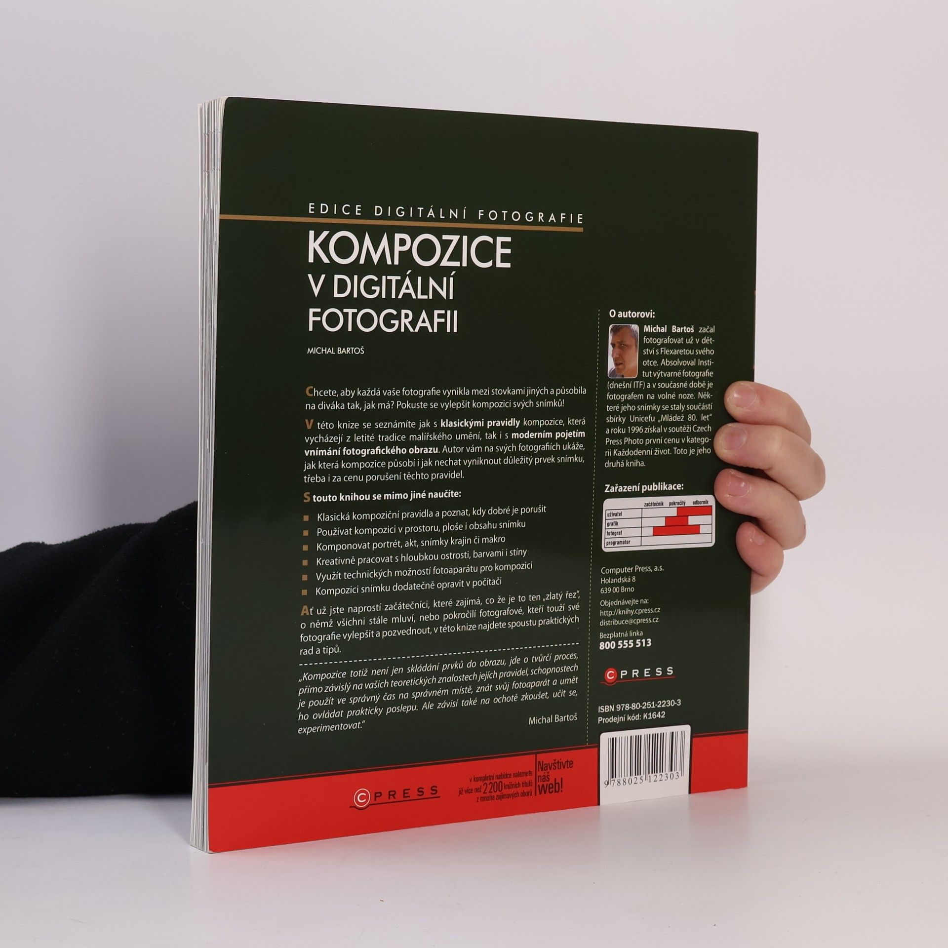 O knize „Kompozice v digitální fotografii“ Chcete, aby každá vaše fotografie vynikla mezi stovkami jiných a působila na diváka tak, jak má? Pokuste se vylepšit kompozici svých snímků! V této knize se seznámíte jak s klasickými pravidly kompozice, která vycházejí z letité tradice malířského umění, tak i s moderním pojetím vnímání fotografického obrazu. Autor vám na svých fotografiích ukáže, jak která kompozice působí i jak nechat vyniknout důležitý prvek snímku, třeba i za cenu porušení těchto pravidel. S touto knihou se mimo jiné naučíte: Klasická kompoziční pravidla a poznat, kdy dobré je porušit Používat kompozici v prostoru, ploše i obsahu snímku Komponovat portrét, akt, snímky krajin či makro Kreativně pracovat s hloubkou ostrosti, barvami i stíny Využít technických možností fotoaparátu pro kompozici Kompozici snímku dodatečně opravit v počítači Ať už jste naprostí začátečníci, které zajímá, co že je to ten „zlatý řez“, o němž všichni stále mluví, nebo pokročilí fotografové, kteř