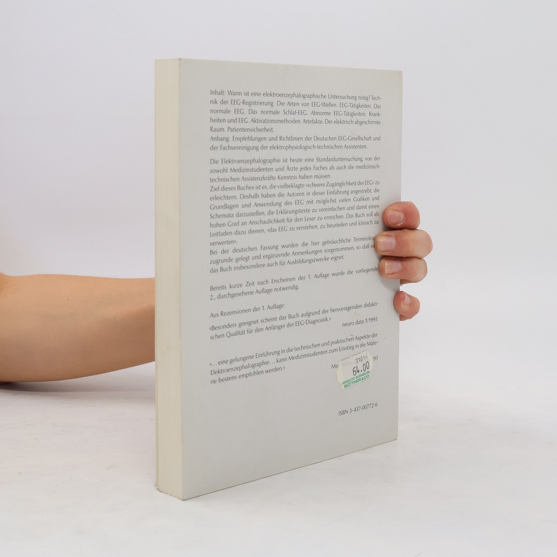 EEG leicht gemacht! Mit vielen Grafiken, vereinfachenden Schemata und kurzen Erläuterungstexten wird das Spektrum dieses Untersuchungsverfahrens auch in der Neuauflage didaktisch hervorragend dargestellt. Aus dem Inhalt: Wann ist ein EEG indiziert? Technische und elektrophysiologische Grundlagen: Wie entsteht das EEG, Ableitungsverfahren, Arten von EEG-Wellen etc. Normales EEG und Schlaf-EEG Abnormes EEG: Krankheiten, Medikamenteneinflüsse Aktivationsmethoden Artefakte Elektrische Raumabschirmung und Patientensicherheit Neu in der 3. Auflage: Simultane EEG-Video-Sequenz-Aufzeichnung Automatische Analyse: Analoge vs. digitale Analyse Epilepsie-Terminologie nach den Regeln der „Dt. Gesellschaft gegen Epilepsie“ und der „Dt. Gesellschaft für klinische Neurophysiologie“, DGKN