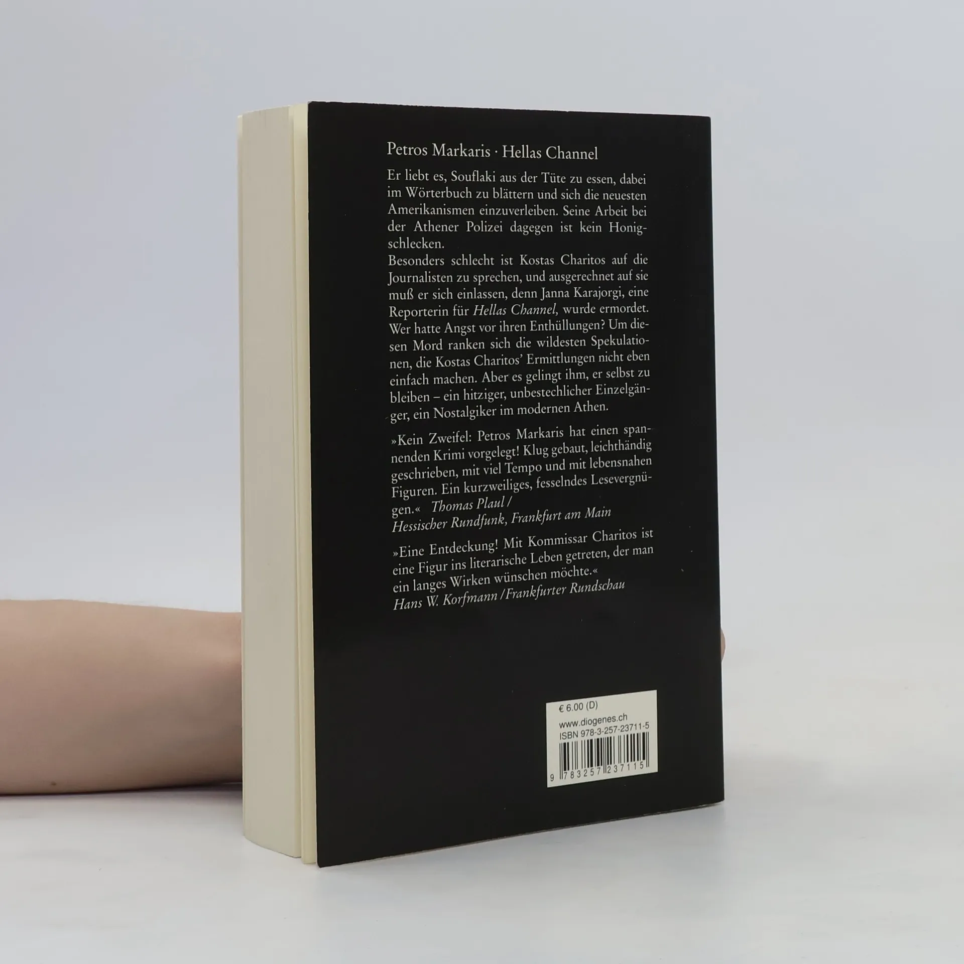 Er liebt es, Souflaki aus der Tüte zu essen, dabei im Wörterbuch zu blättern und sich die neuesten Amerikanismen einzuverleiben. Seine Arbeit bei der Athener Polizei dagegen ist kein Honigschlecken. Im Trubel um den Mord an der Reporterin von ›Hellas Channel‹ gelingt es Kostas Charitos dennoch stets, er selbst zu bleiben – ein hitziger Einzelgänger, ein Nostalgiker im modernen Athen.