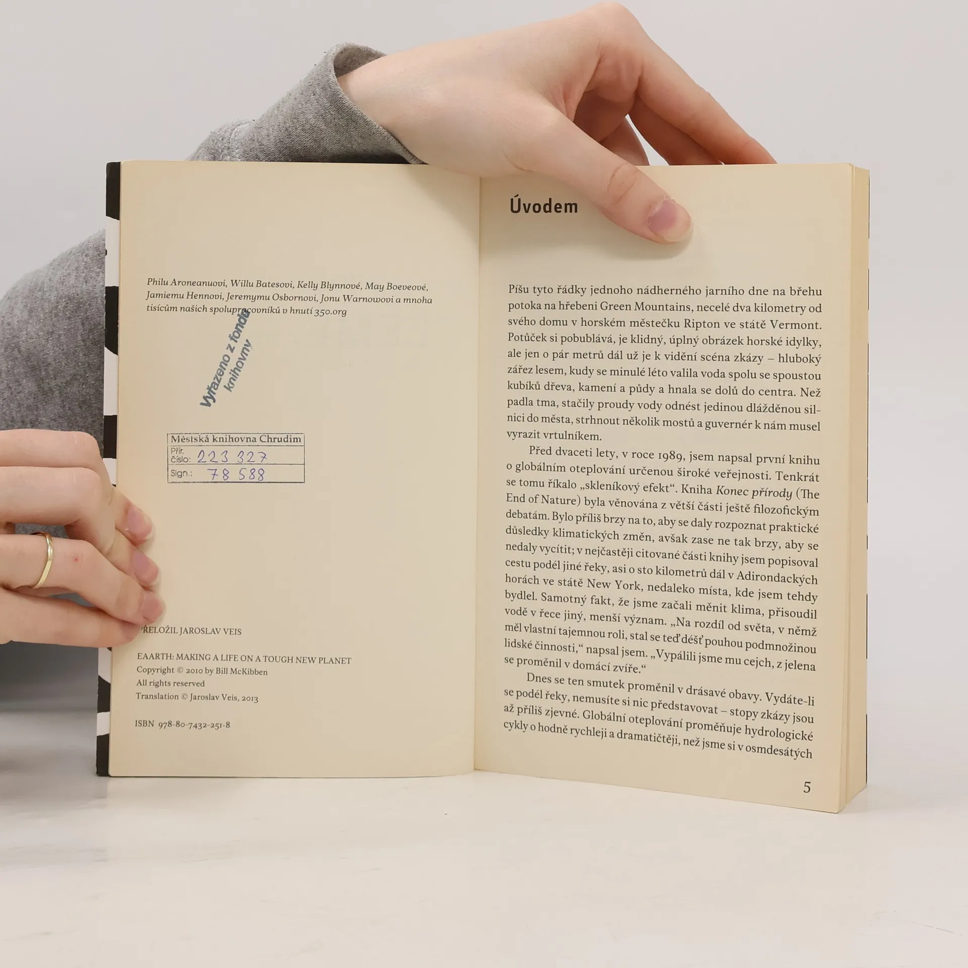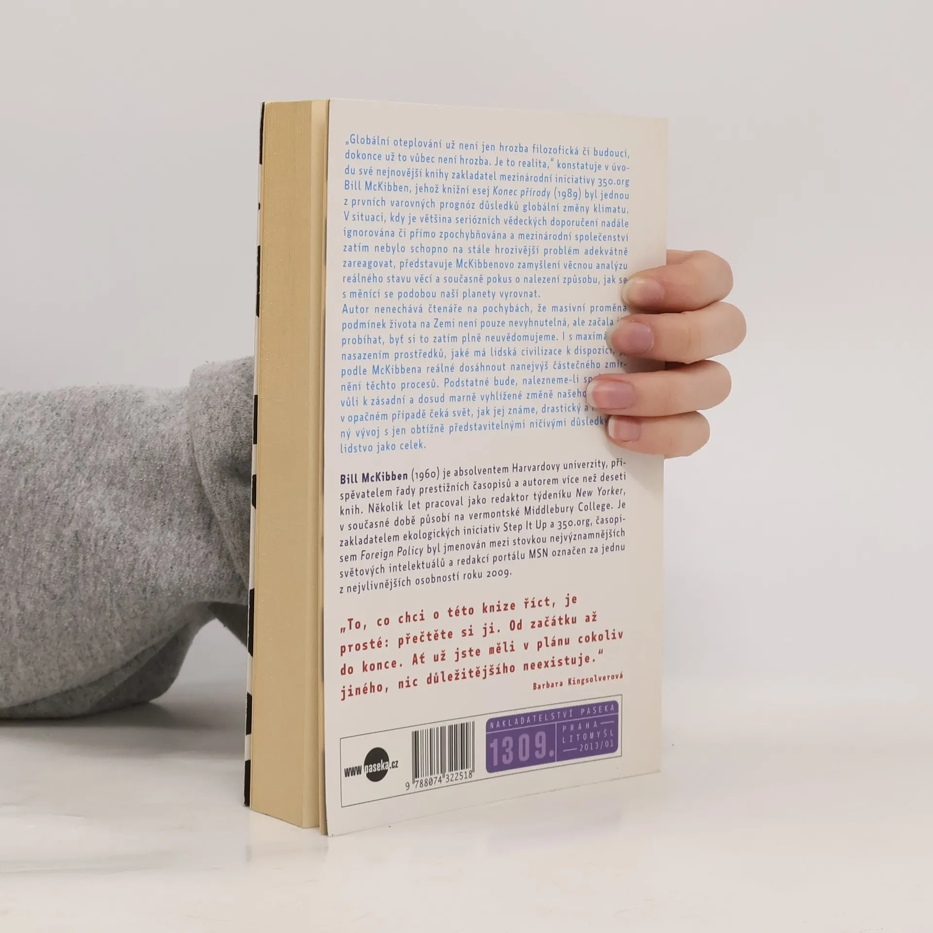„Globální oteplování již není jen teoretickou či budoucí hrozbou, není hrozbou vůbec. Je skutečností, v níž žijeme," konstatuje ve své nejnovější knize zakladatel mezinárodní iniciativy 350.org Bill McKibben, jehož kniha Konec přírody (1989) byla jednou z prvních varovných prognóz důsledků globální změny klimatu. V situaci, kdy je většina seriózních vědeckých doporučení nadále ignorována či přímo zpochybňována a mezinárodní společenství zatím nebylo schopno na stále hrozivější problém adekvátně zareagovat, představuje McKibbenovo zamyšlení příkladně věcnou a realistickou analýzu skutečného stavu, v němž se nacházíme, a současně pokus o nalezení způsobu, jak se s reálným stavem věcí vyrovnat. Autor nenechává čtenáře na pochybách, že masivní proměna podmínek života na Zemi není pouze nevyhnutelná, ale začala již probíhat, byť si to zatím plně neuvědomujeme. I s maximálním nasazením prostředků, jaké má lidská civilizace k dispozici, není podle McKibbena reálné dosáhnout víc než jen částečného zmírnění těchto procesů. Podstatné bude, nalezneme-li společnou vůli k zásadní a dosud marně vyhlížené změně našeho chování; v opačném případě čeká svět, jak jej známe, drastický a nezvratný vývoj s jen obtížně představitelnými ničivými důsledky pro lidstvo jako celek.