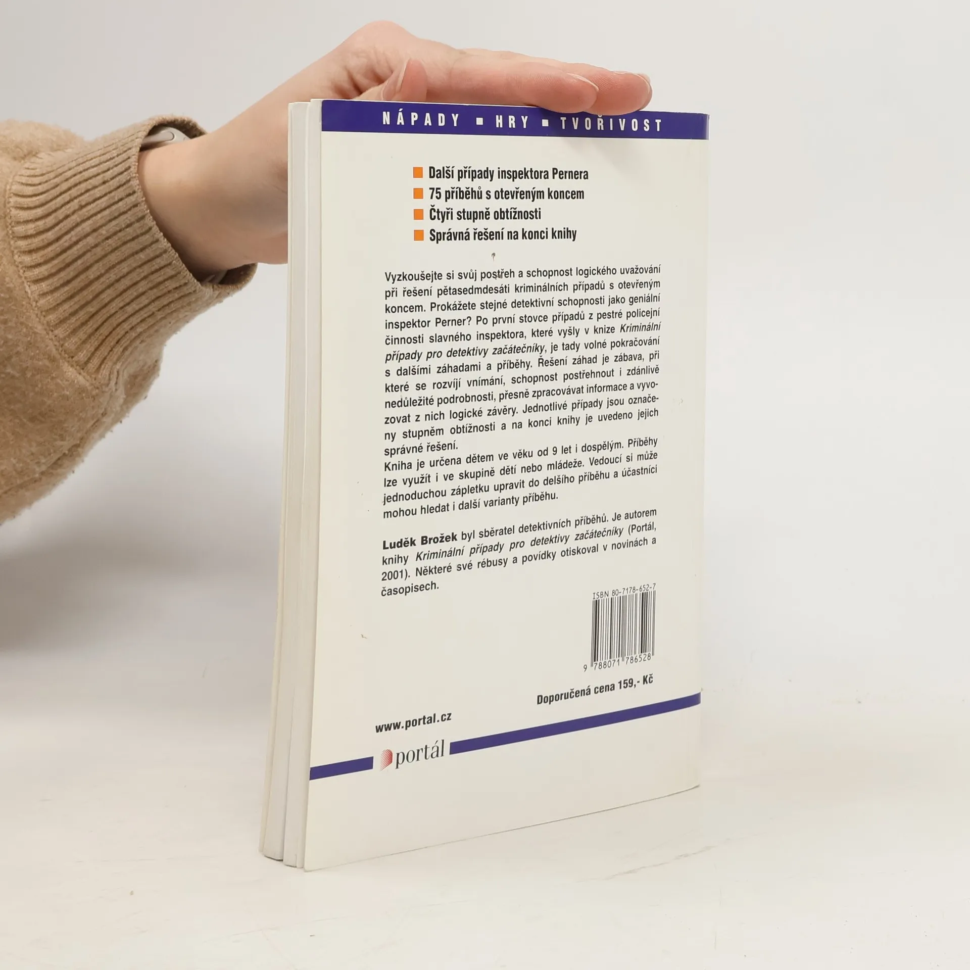 Obálkový podnázev: 75 případů k řešení pro děti od 9 let Vyzkoušejte si svůj postřeh a schopnost logického uvažování při řešení pětasedmdesáti kriminálních případů s otevřeným koncem. Prokážete stejné detektivní schopnosti jako geniální inspektor Perner? Po první stovce případů z pestré policejní činnosti slavného inspektroa, které vyšly v knize "Kriminální případy pro detektivy začátečníky", je tady volné pokračování s dalšími záhadami a příběhy. Řešení záhad je zábava, při které se rozvíjí vnímání, schopnost postřehnout i zdánlivě nedůležité podrobnosti, přesně zpracovávat informace a vyvozovat z nich logické závěry. Jednotlivé případy jsou označeny stupněm obtížnosti a na konci knihy je uvedeno jejich správné řešení. Kniha je určena dětem ve věku od 9 let i dospělým. Příběhy lze využít i ve skupině dětí nebo mládeže. Vedoucí si může jednoduchou zápletku upravit do delšího příběhu a účastníci mohou hledat i další varianty příběhu.