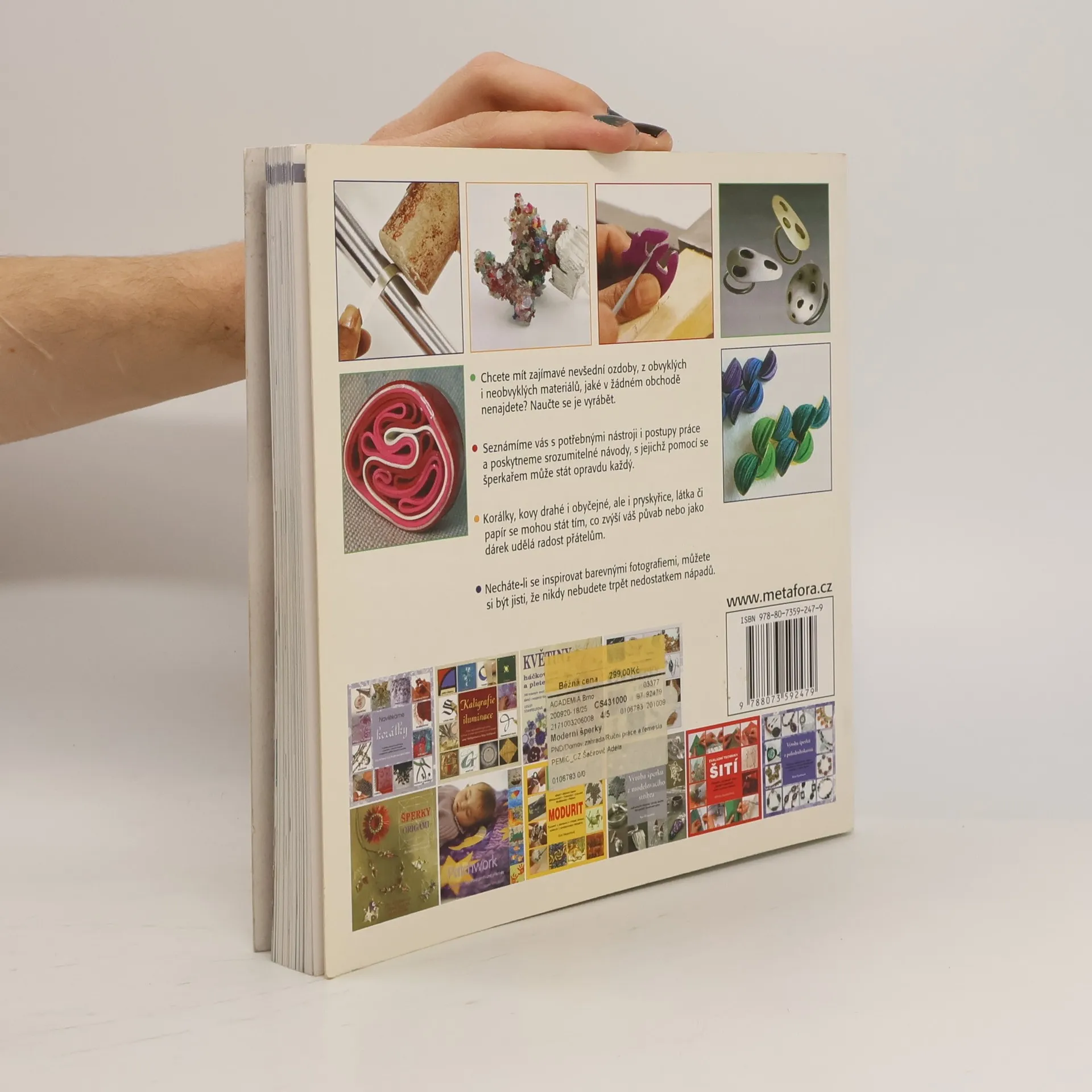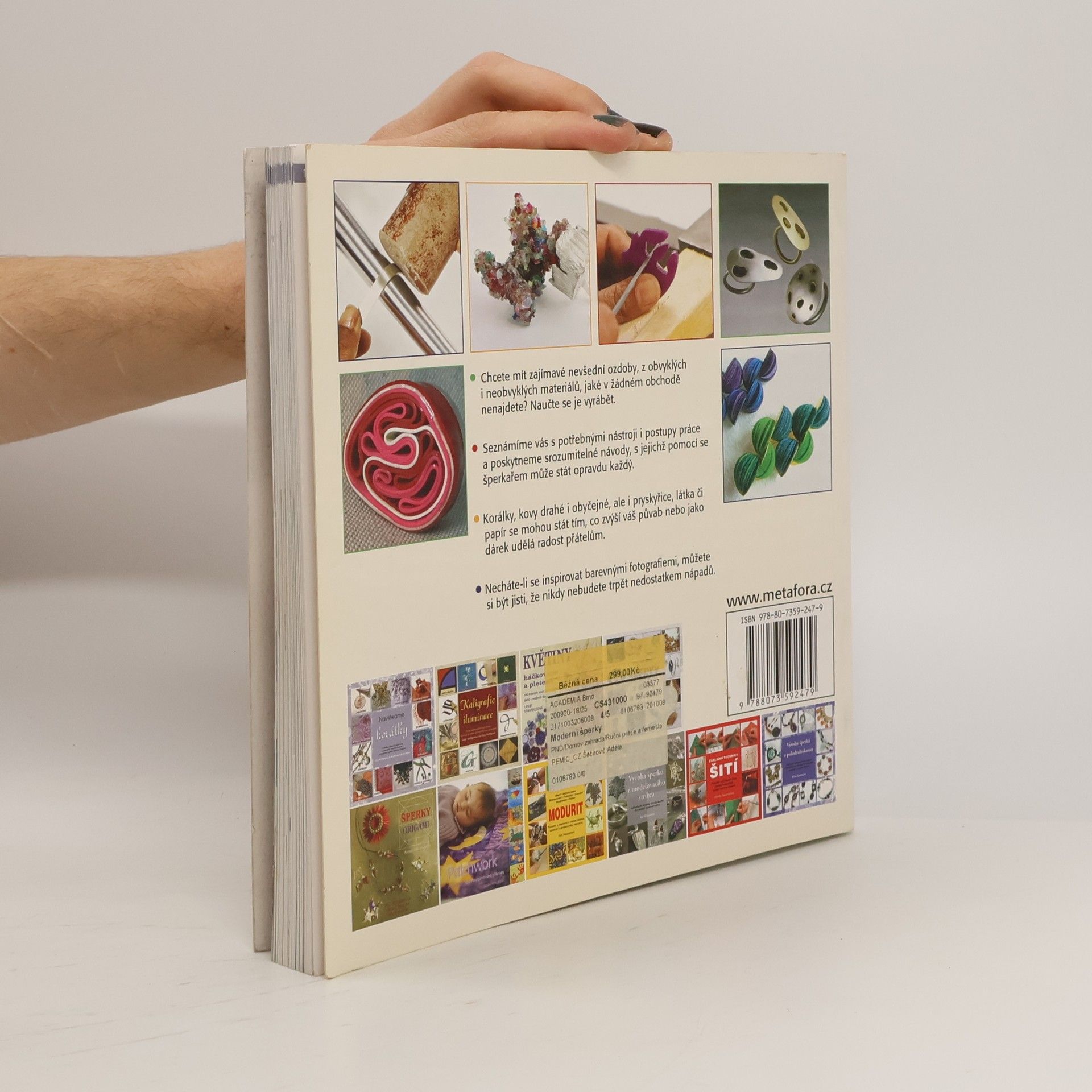 Inspirace k tvorbě originálních ozdob a šperků z netradičních materiálů Techniky a metody práce s drahými i obyčejnými kovy, dráty a korálky, plastem, gumou, látkou, semišem, vlnou, kůží, papírem, dřevem, sklem, keramikou, betonem i pryskyřicí... Chcete mít zajímavé nevšední ozdoby, z obvyklých i neobvyklých materiálů, jaké v žádném obchodě nenajdete? Naučte se je vyrábět. Seznámíme vás s potřebnými nástroji i postupy práce a poskytneme srozumitelné návody, s jejichž pomocí se šperkařem může stát opravdu každý. Korálky, kovy drahé i obyčejné, ale i pryskyřice, látka či papír se mohou stát tím, co zvýší váš půvab nebo jako dárek udělá radost přátelům. Necháte-li se inspirovat barevnými fotografiemi, můžete si být jisti, že nikdy nebudete trpět nedostatkem nápadů.