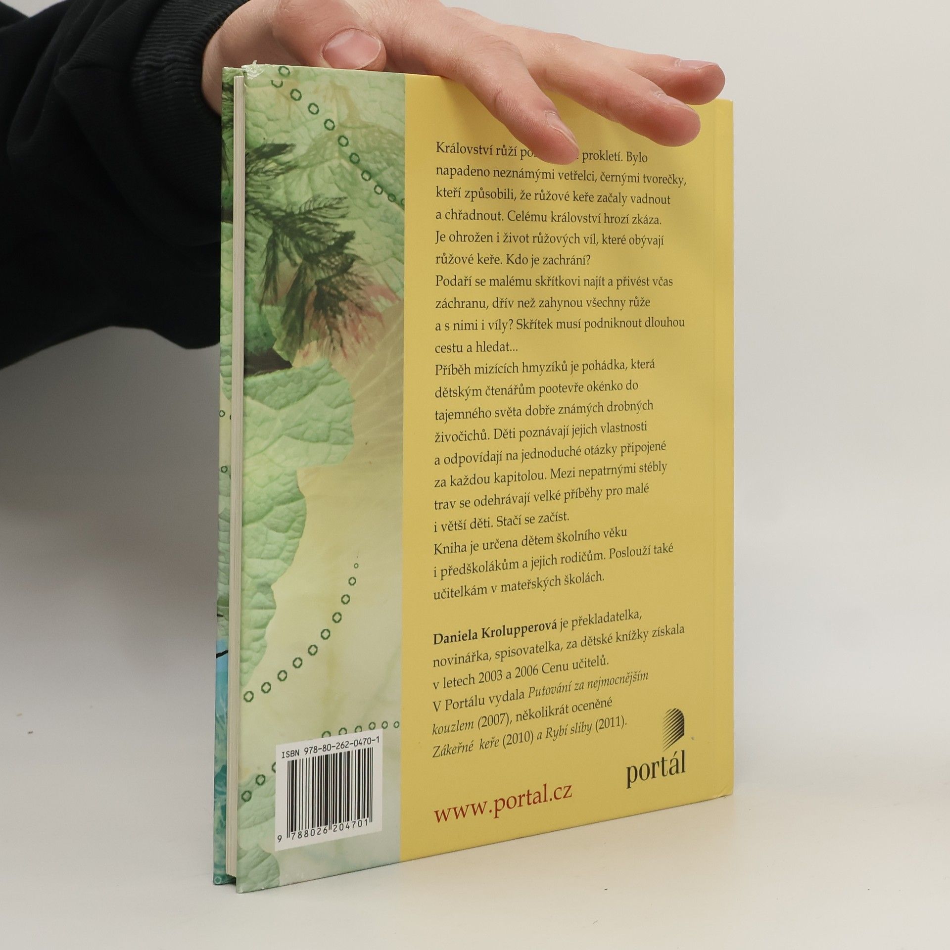 Království růží postihlo zlé prokletí. Bylo napadeno neznámými vetřelci, černými tvorečky, kteří způsobili, že růžové keře začaly vadnout a chřadnout. Celému království hrozí skáza. Je ohrožen i život růžových víl obývajících růžové keře. Najdou víly někoho, kdo je zachrání? Příběh mizících hmyzíků je pohádka, která dětským čtenářům pootevře okénko do tajemného světa dobře známých drobných živočichů. Poznává jejich vlastnosti a řeší jednoduché otázky připojené za každou kapitolou. Mezi nepatrnými stébly trav se odehrávají velké příběhy pro malé (i větší) děti. Stačí se začíst. Kniha je určena dětem mladšího školního věku, předškolákům a jejich rodičům. Poslouží také učitelkám v mateřských školách. Daniela Krolupperová je překladatelka, novinářka, spisovatelka, za dětské knížky získala v letech 2003 a 2006 Cenu učitelů. V Portálu vyšla její kniha Putování za nejmocnějším kouzlem (2007), Zákeřné keře (2010), Rybí sliby (2011).