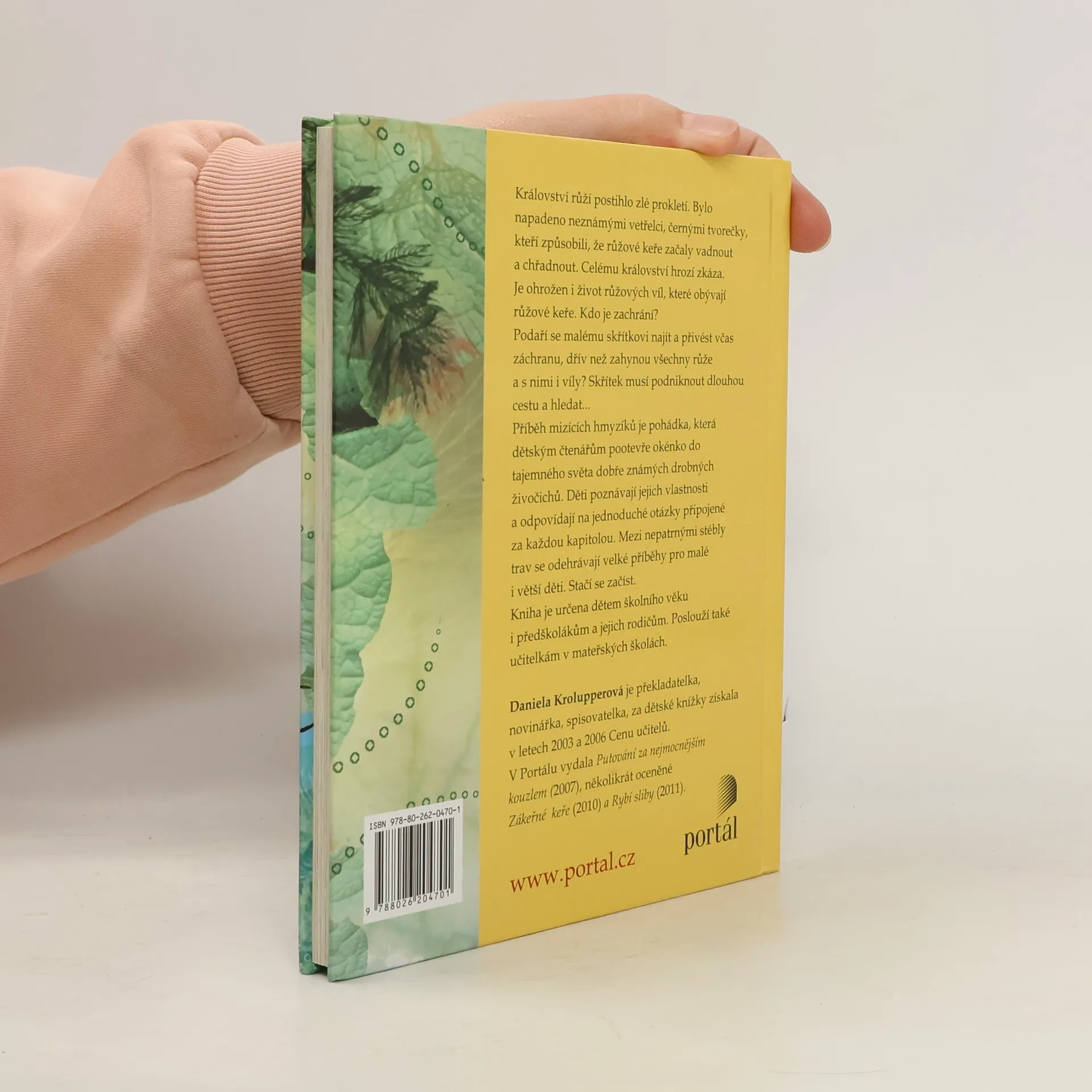Království růží postihlo zlé prokletí. Bylo napadeno neznámými vetřelci, černými tvorečky, kteří způsobili, že růžové keře začaly vadnout a chřadnout. Celému království hrozí skáza. Je ohrožen i život růžových víl obývajících růžové keře. Najdou víly někoho, kdo je zachrání? Příběh mizících hmyzíků je pohádka, která dětským čtenářům pootevře okénko do tajemného světa dobře známých drobných živočichů. Poznává jejich vlastnosti a řeší jednoduché otázky připojené za každou kapitolou. Mezi nepatrnými stébly trav se odehrávají velké příběhy pro malé (i větší) děti. Stačí se začíst. Kniha je určena dětem mladšího školního věku, předškolákům a jejich rodičům. Poslouží také učitelkám v mateřských školách. Daniela Krolupperová je překladatelka, novinářka, spisovatelka, za dětské knížky získala v letech 2003 a 2006 Cenu učitelů. V Portálu vyšla její kniha Putování za nejmocnějším kouzlem (2007), Zákeřné keře (2010), Rybí sliby (2011).