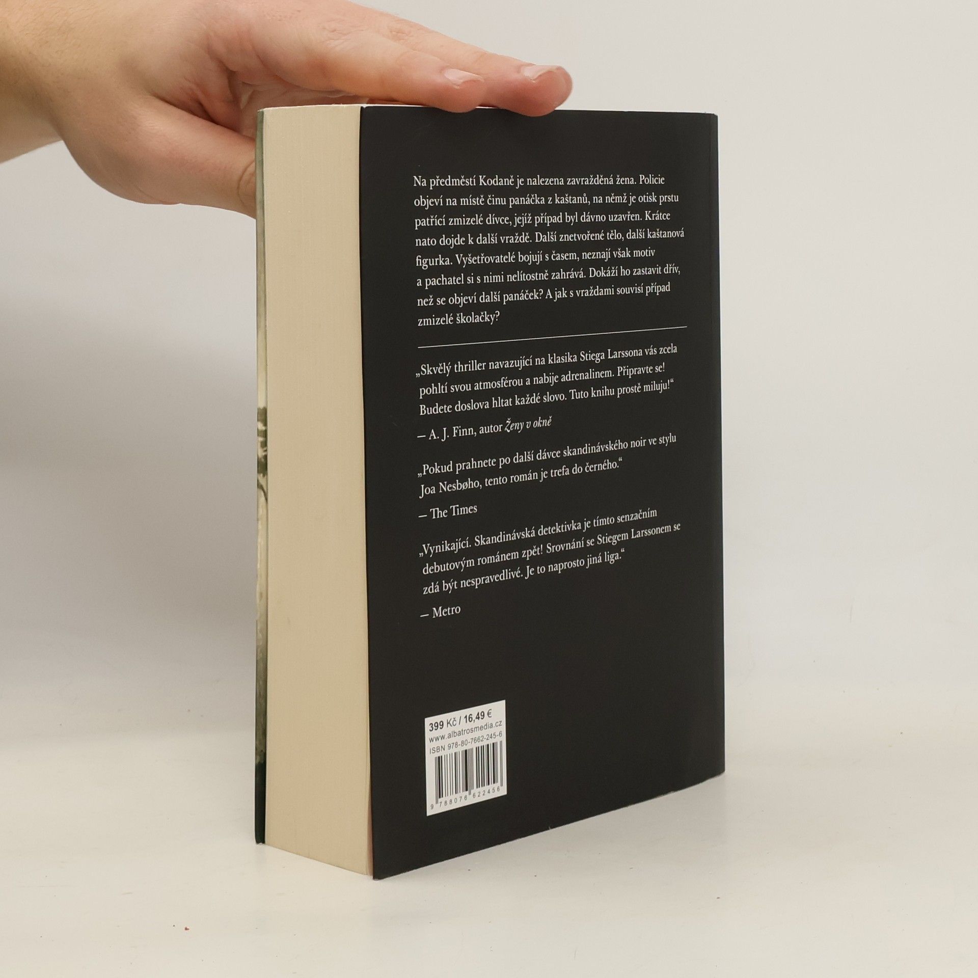 Podmanivý thriller od autora dánského seriálového hitu Zločin. Jednoho sychravého podzimního dne najde policie na předměstí Kodaně tělo mladé ženy. Někdo ji brutálně zavraždil a uřízl jednu ruku. Nad obětí visí panáček z kaštanů. Případu se ujímá mladá a ambiciózní vyšetřovatelka Naia Thulinová. Za parťáka dostane vyhořelého kolegu Marka Hesse, kterého právě vyhodili z hlavního sídla Europolu v Haagu a poslali zpět do Kodaně. Brzy přijdou na to, že kaštanový panáček na sobě nese stopu po zmizelé dívce, o které se všichni domnívají, že byla před rokem zavražděna: jedná se o dceru Rosy Hartungové, ministryně sociálních věcí. Případ je dávno objasněný a pachatel se k vraždě přiznal. Krátce nato je ale nalezena další oběť a s ní i další kaštanová figurka se stopou po mrtvé dívce. Thulinová s Hessem pátrají po souvislostech mezi případem dcery ministryně, zavražděnými ženami a vrahem, kterému se daří šířit strach po celé zemi. Hrají o čas. Obávají se, že se pachatel vydal na vražednou misi, která pro něho ještě zdaleka neskončila.