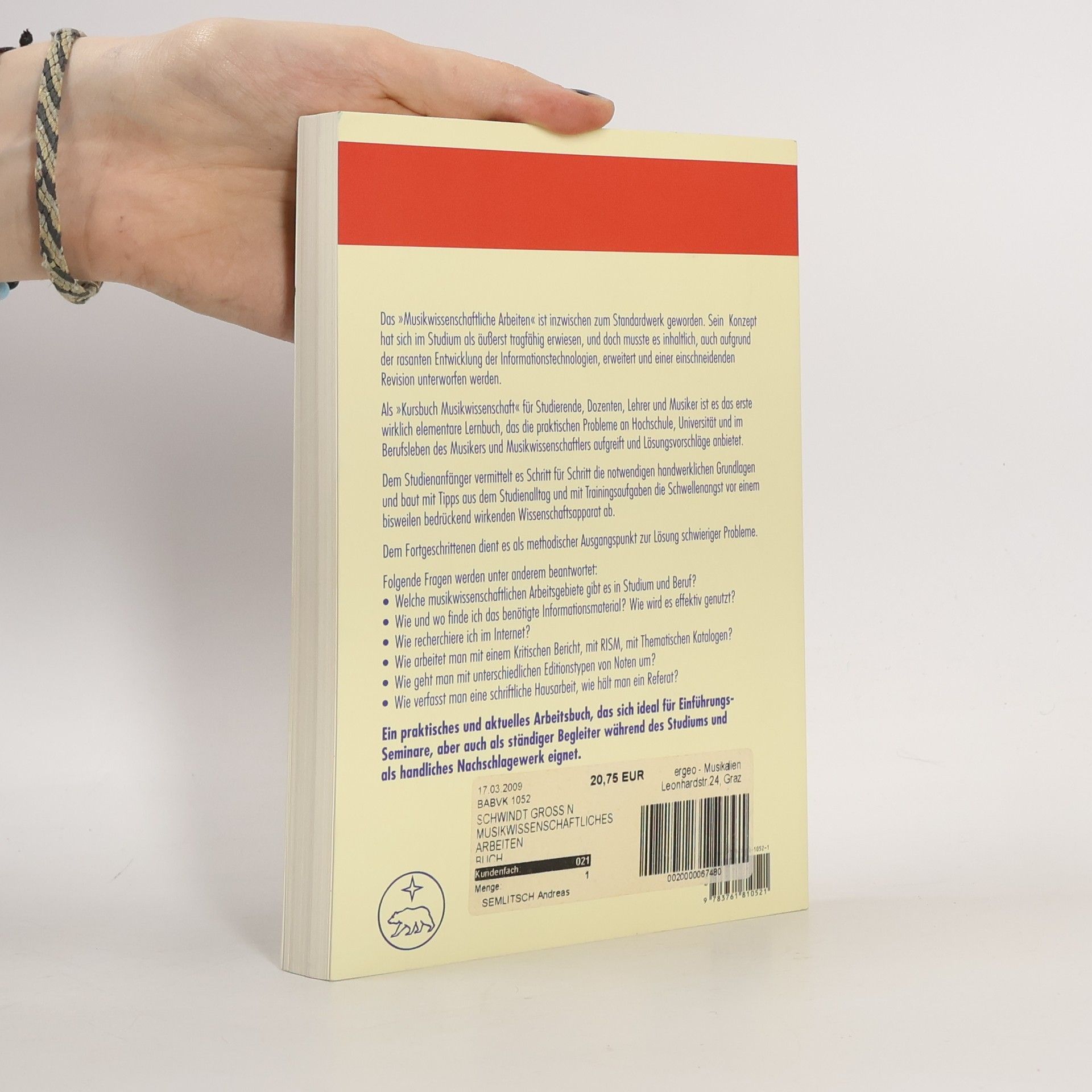Das „Musikwissenschaftliche Arbeiten“ ist inzwischen zum Standardwerk geworden. Sein Konzept hat sich im Studium als äußerst tragfähig erwiesen, und doch musste es inhaltlich, auch aufgrund der rasanten Entwicklung der Informationstechnologien, erweitert und einer einschneidenden Revision unterworfen werden. Als „Kursbuch Musikwissenschaft“ für Studierende, Dozenten, Lehrer und Musiker ist es das erste wirklich elementare Lernbuch, das die praktischen Probleme an Hochschule, Universität und im Berufsleben des Musikers und Musikwissenschaftlers aufgreift und Lösungsvorschläge anbietet. Dem Studienanfänger vermittelt es Schritt für Schritt die notwendigen handwerklichen Grundlagen und baut mit Tipps aus dem Studienalltag und mit Trainingsaufgaben die Schwellenangst vor einem bisweilen bedrückend wirkenden Wissenschaftsapparat ab. Dem Fortgeschrittenen dient es als methodischer Ausgangspunkt zur Lösung schwieriger Probleme.