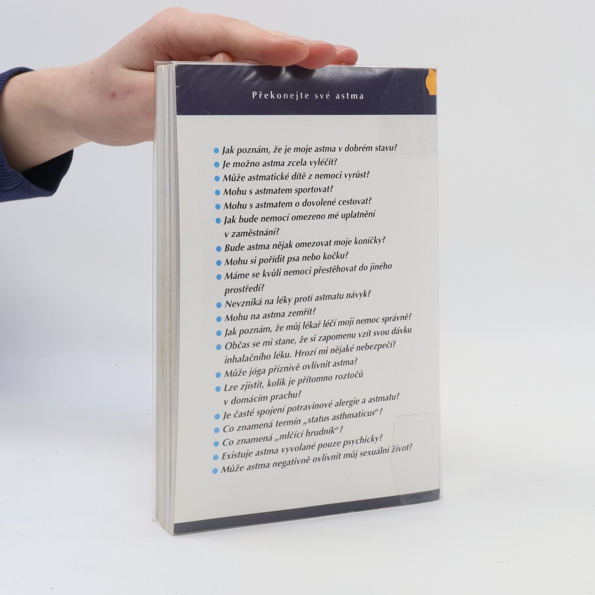 Nejnovější informace o průduškovém astmatu, jeho příčinách, prevenci a léčbě. Kniha je určena pro pacienty-astmatiky a střední zdravotnický personál, je psána přehledně a srozumitelně pro vzdělanější veřejnost. Kniha je rozdělena do několika kapitol, které podrobně vysvětlují, co to vlastně astma je, jaké jsou jeho příčiny a jak vzniká, s jakými alergeny se doma i venku astmatik nejčastěji setkává, jak se astma diagnostikuje a velká pozornost je věnovaná prevenci a léčbě astmatu. Kniha je doplněna nejčastějšími otázkami, s kterými se lékaři u svých pacientů setkávají, přehledem u nás dostupných přípravků užívaných k léčbě astmatu a slovníčkem nejčastějších pojmů