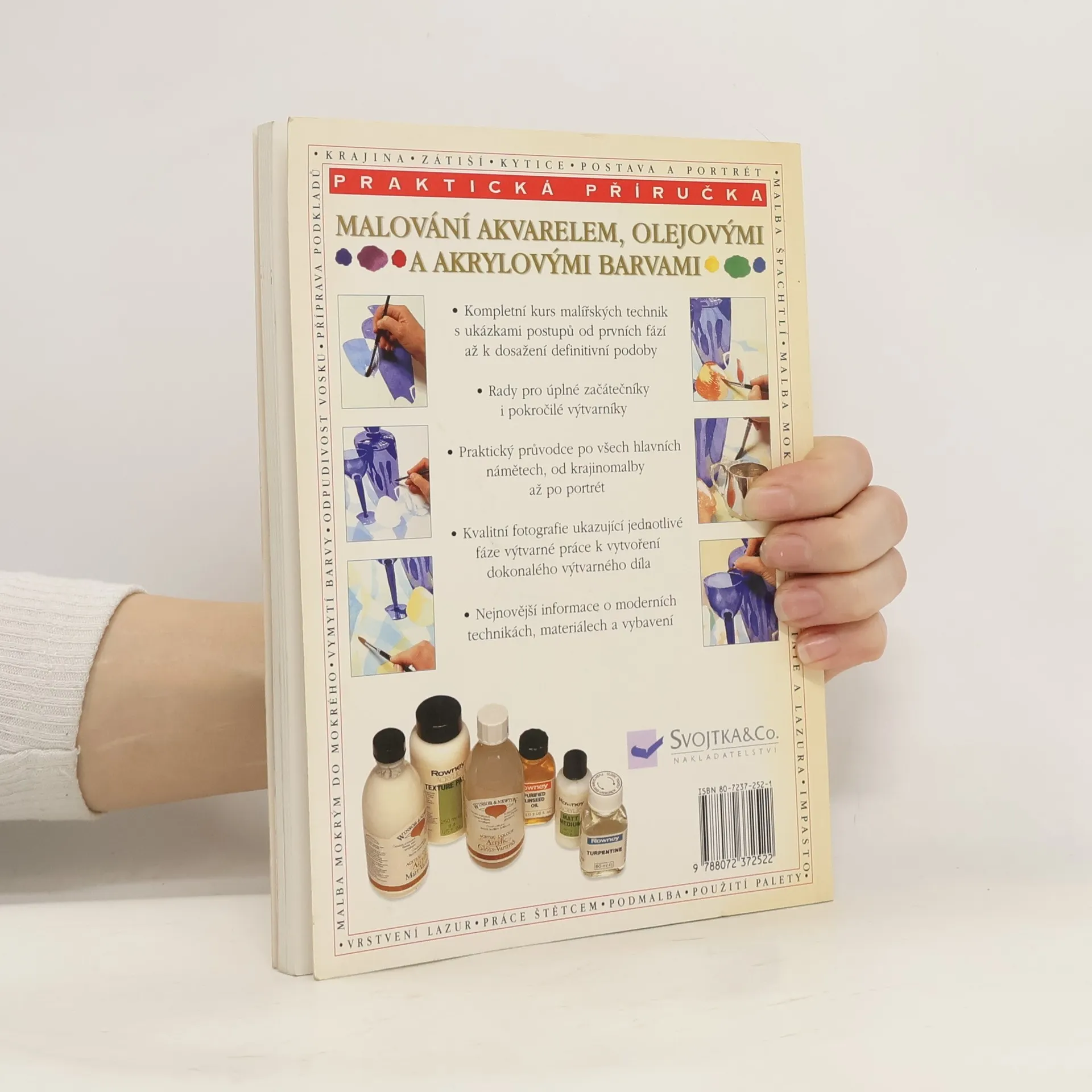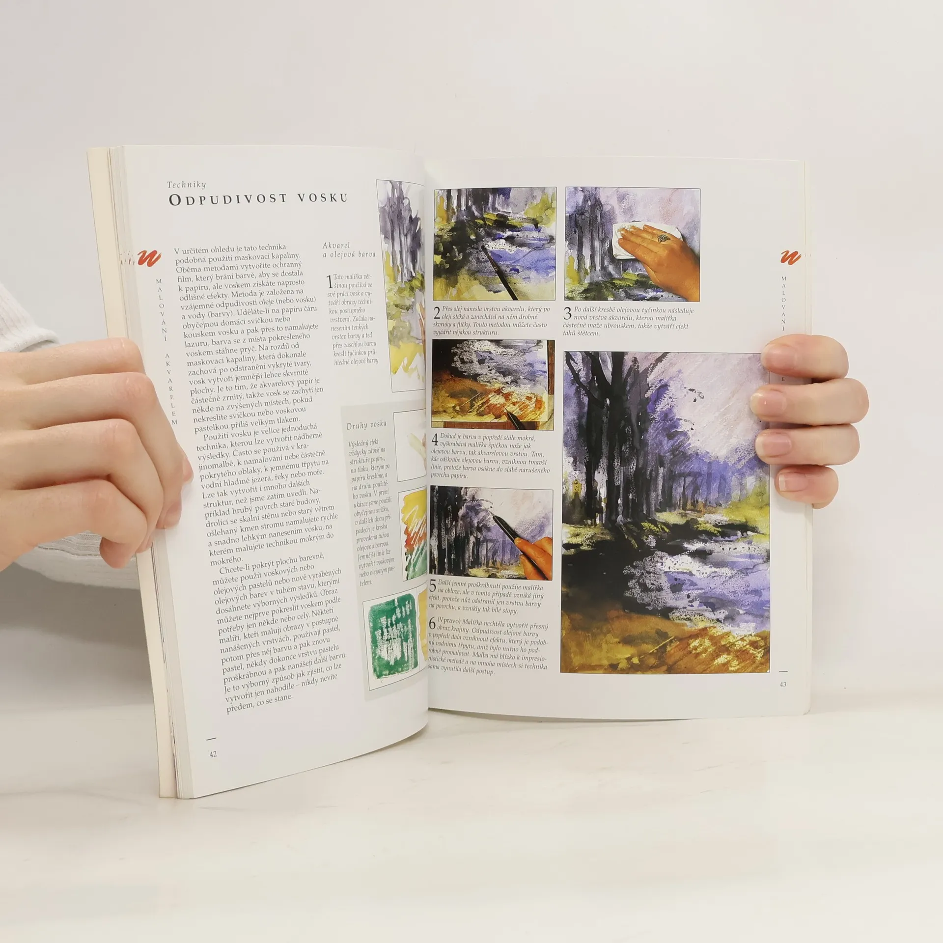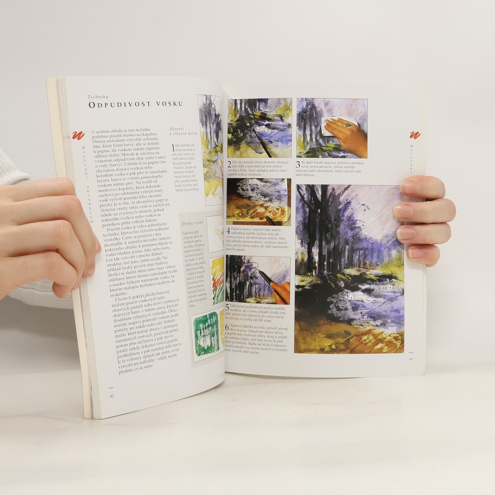 Praktická příručka. Malba mokrým do mokrého, vymytí barvy, odpudivost vosku, příprava podkladů, krajina, zátiší, kytice, postava a portrét, malba špachtlí, malba mokrým na suché, linie a lazura, impasto, vrstvení lazur, práce štětcem, podmalba, použití palety.