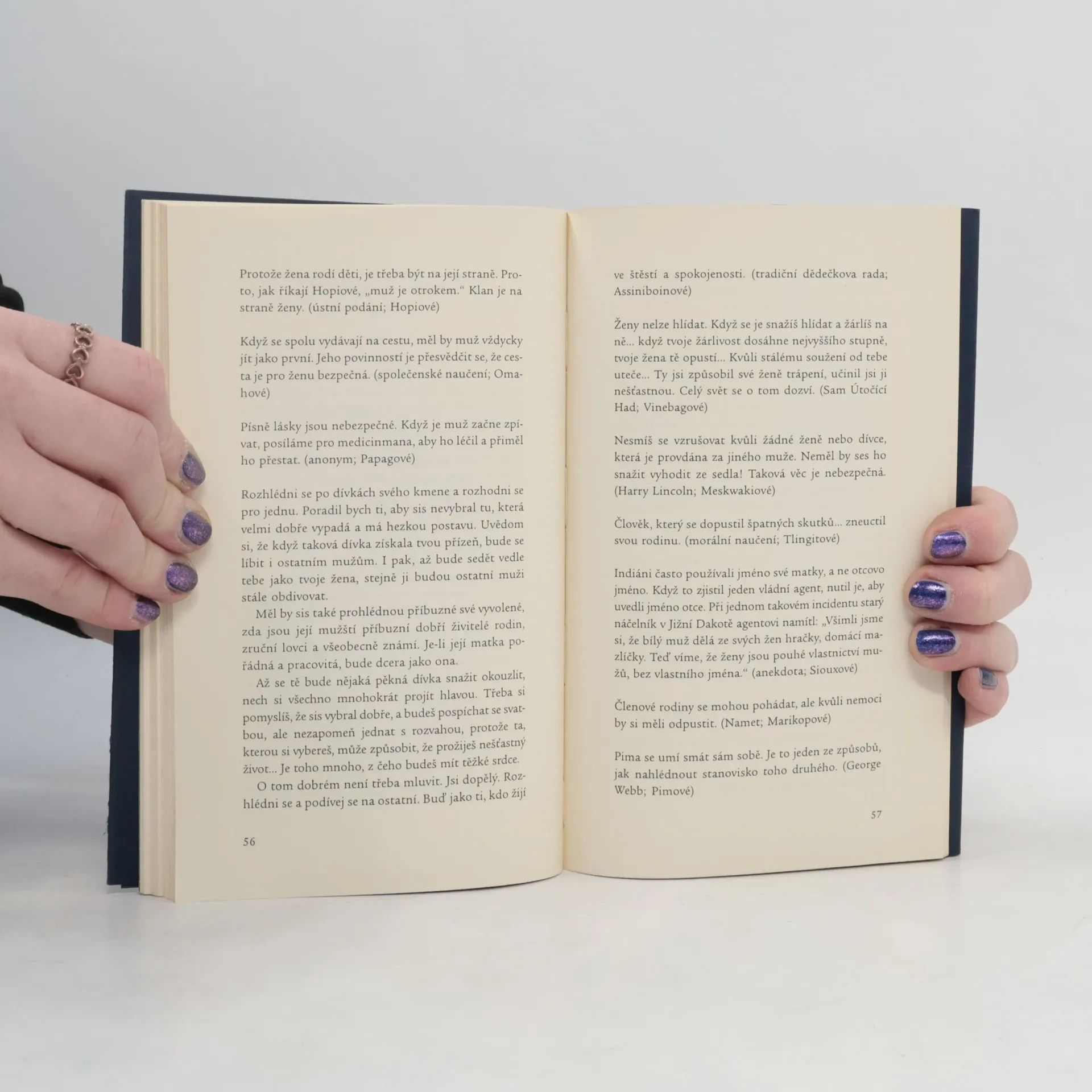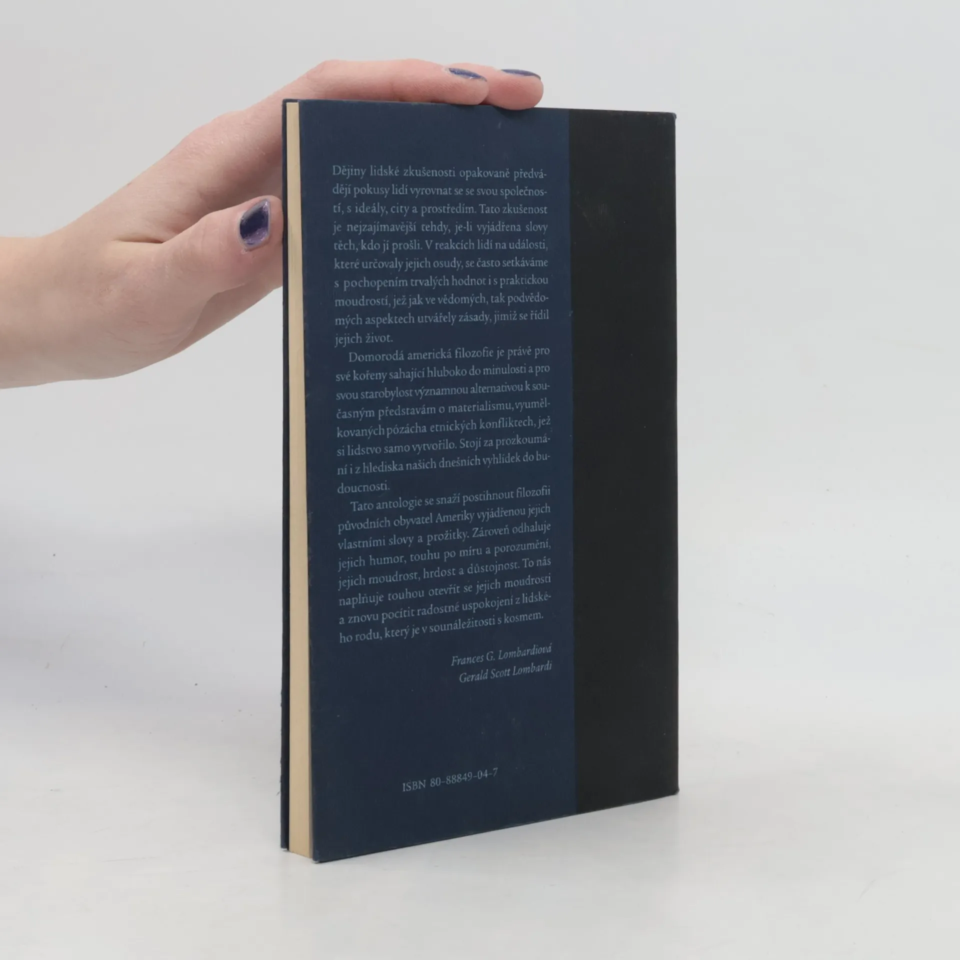 Dějiny lidské zkušenosti opakovaně předvádějí pokusy lidí vyrovnat se se svou společností, s ideály, city a prostředím. Tato zkušenost je nejzajímavější tehdy, je-li vyjádřena slovy těch, kdo jí prošli. V reakcích lidí na události, které určovaly jejich osudy, se často setkáváme s pochopením trvalých hodnot i s praktickou moudrostí, jež jak ve vědomých, tak podvědomých aspektech utvářely zásady, jimiž se řídil jejich život. Domorodá americká filozofie je právě pro své kořeny sahající hluboko do minulosti a pro svou starobylost Významnou alternativou k současným představám o materialismu, vyumělkovaných pózách a etnických konfliktech, jež si lidstvo samo vytvořilo. Stojí za prozkoumání i z hlediska našich dnešních vyhlídek do budoucnosti. Tato antologie se snaží postihnout filozofii původních obyvatel Ameriky vyjádřenou jejich vlastními slovy a prožitky. Zároveň odhaluje jejich humor, touhu po míru a porozumění, jejich moudrost, hrdost a důstojnost. To nás naplňuje touhou otevřít se jejich moudrosti a znovu pocítit radostné uspokojení z lidského rodu, který je v sounáležitosti s kosmem. Frances G. Lombardiová, Gerald Scott Lombardi