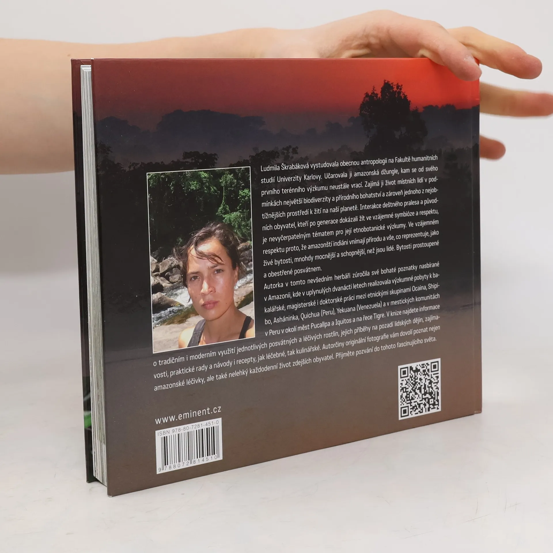 Mgr. Ludmila Škrabáková, doktorandka na Fakultě humanitních studií Univerzity Karlovy, se specializuje na obecnou antropologii a fascinují ji amazonské džungle. Od svého prvního výzkumu k bakalářské práci se neustále vrací do této oblasti, aby zkoumala život místních obyvatel v prostředí s největší biodiverzitou a přírodním bohatstvím, ale také v jednom z nejobtížnějších prostředí na Zemi. Její etnobotanické výzkumy se zaměřují na interakci deštného pralesa a původních obyvatel, kteří žijí v symbióze a respektu k přírodě, kterou vnímají jako živé bytosti, často mocnější než lidé. V tomto herbáři autorka shrnuje bohaté poznatky z dvanáctiletého výzkumu mezi etnickými skupinami jako Ocaina, Shipibo, Asháninka, Quichua (Peru), Yekuana (Venezuela) a mestickými komunitami v Peru. Kniha obsahuje informace o posvátných a léčivých rostlinách, jejich příběhy, praktické rady, návody a recepty na léčebné i kulinářské využití. Originální fotografie autorky přibližují nejen amazonské léčivky, ale i každodenní život místních obyvatel. Přijměte pozvání do fascinujícího světa amazonské džungle.