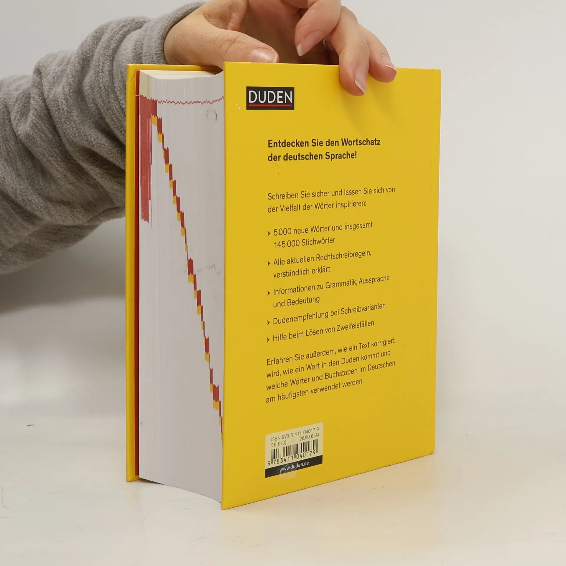 Rund 145.000 Stichwörter, davon rund 5000 neu - Informationen zu Grammatik, Aussprache, Bedeutung - Empfehlungen bei Schreibvarianten - Hilfe beim Lösen von Zweifelsfällen - nach dem Stand der Rechtschreibregelungen vom Juni 2017 Und auf 140 Seiten erklären wir Rechtschreib- und Zeichensetzungsregeln, wie ein Wort in den Duden kommt, welche Wörter am häufigsten verwendet werden, wie ein Text korrigiert wird und vieles mehr