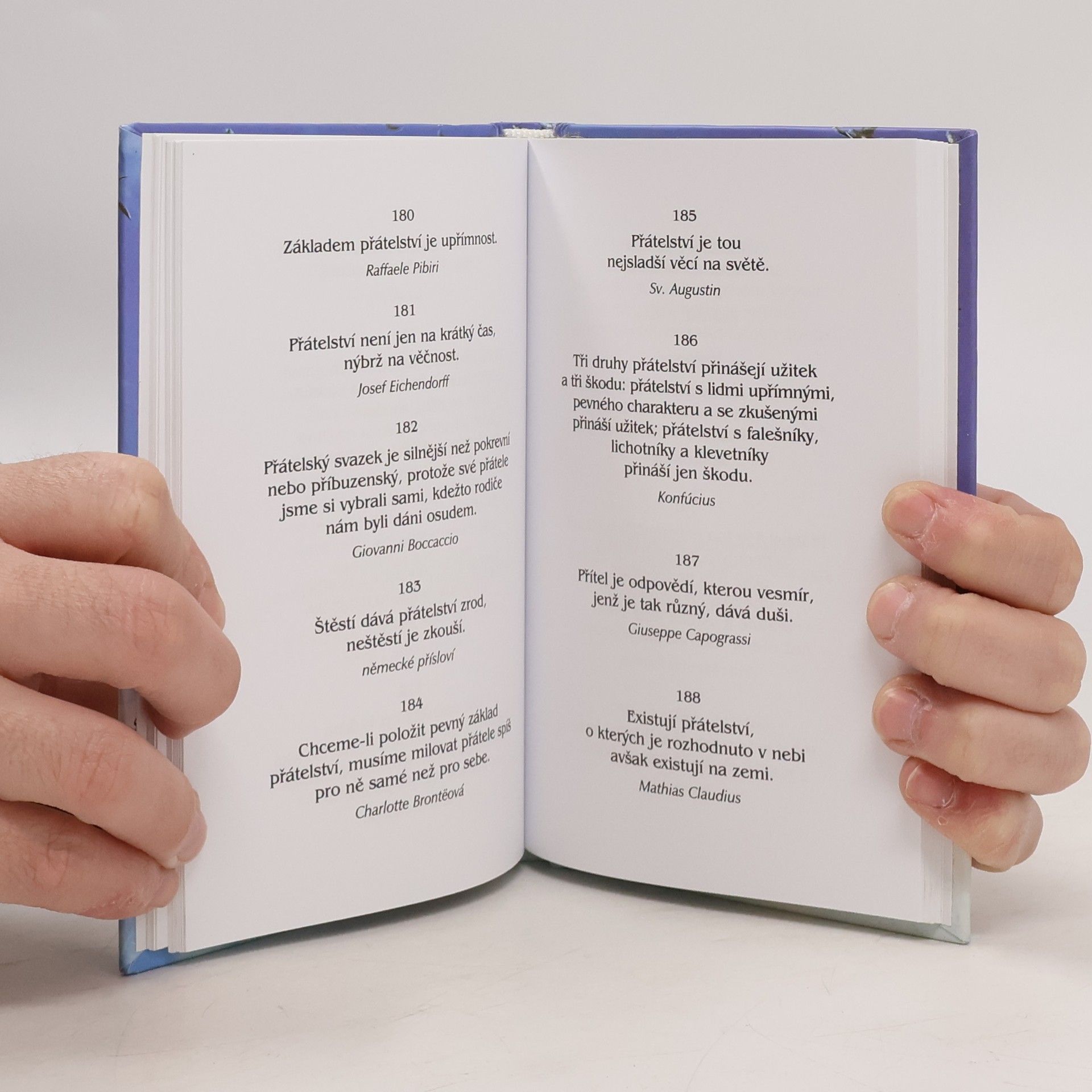 Výběr z citátů velkých světových osobností nám přibližuje hodnoty přátelství. Výroky významných politiků, duchovních vůdců, filozofů, umělců, vědců (např. Aristotelés, Balzac, Gándhí, Hrubín, Ibsen, Kainar, Kant, Luther, Napoleon Bonaparte, Pascal, Shakespeare, Schopenhauer, Sládek, Twain, a další) nás přivádějí k poznání skutečností, nad kterými se v běžném denním shonu obvykle nezamýšlíme. Mnohé věci bereme příliš samozřejmě; máme kolem sebe tolik lidí, že si ani nevšimneme, jestliže opravdoví přátelé mezi nimi chybějí.