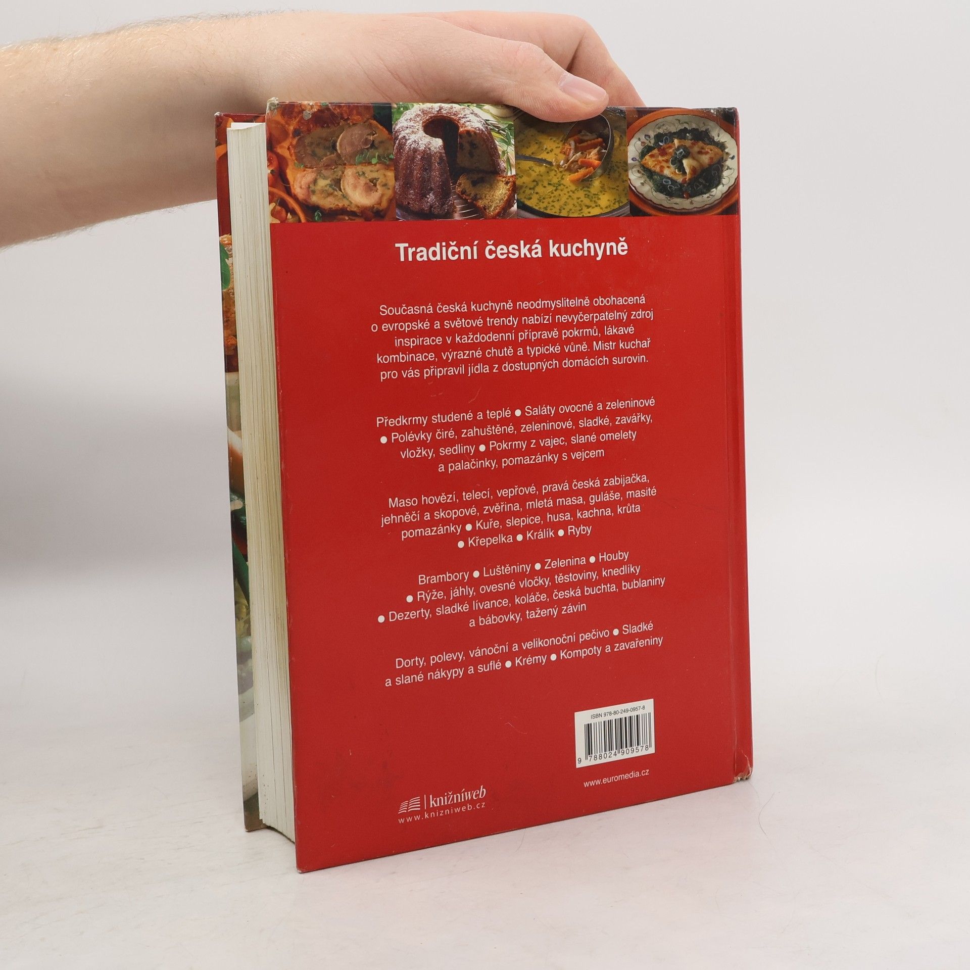 Tradiční česká kuchyně Současná česká kuchyně neodmyslitelně obohacená o evropské a světové trendy nabízí nevyčerpatelný zdroj inspirace v každodenní přípravě pokrmů, lákavé kombinace, výrazné chutě a typické vůně. Mistr kuchař pro vás připravil jídla z dostupných domácích surovin. Předkrmy studené a teplé Saláty ovocné a zeleninové Polévky čiré, zahuštěné, zeleninové, sladké, zavářky, vložky, sedliny Pokrmy z vajec, slané omelety a palačinky, pomazánky s vejcem Maso hovězí, telecí, vepřové, pravá česká zabijačka, jehněčí a skopové, zvěřina, mletá masa, guláše, masité pomazánky Kuře, slepice, husa, kachna, krůta Křepelka Králík Ryby Brambory Luštěniny Zelenina Houby Rýže, jáhly, ovesné vločky, těstoviny, knedlíky Dezerty, sladké lívance, koláče, česká buchta, bublaniny a bábovky, tažený závin Dorty, polevy, vánoční a velikonoční pečivo Sladké a slané nákypy a suflé Krémy kompoty a zavařeniny