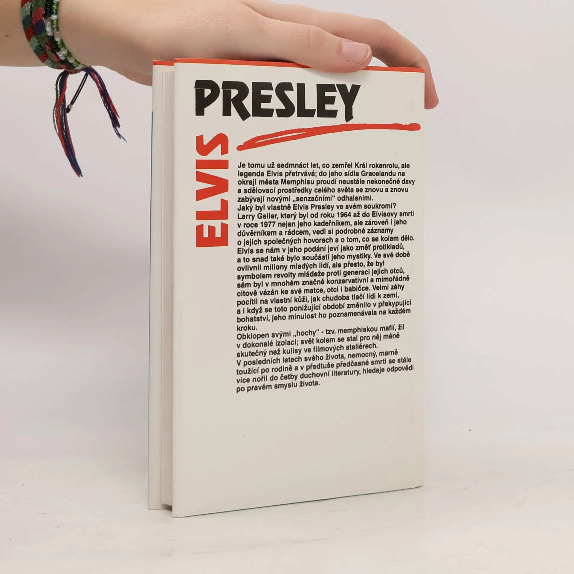 Napsáno podle tajného deníku Larryho Gellera, Elvisova přítele a důvěrníka. Jaký byl vlastně Elvis Presley ve svém soukromí? Larry Geller, který byl od roku 1964 až do Elvliovy smrti v roce 1977 nejen jeho kadeřníkem, ale zároveň i jeho důvěrníkem a rádcem, vedl si podrobné záznamy o jejich společných hovorech a o tom, co se kolem dělo. Elvis se nám v jeho podání jeví jako změť protikladů, a to snad také bylo součástí jeho mystiky. Ve své době ovlivnil miliony mladých lidí, ale přesto, byl symbolem revolty mládeže proti generaci jejich otců, sám byl v mnohém značně konzervativní a mimořádné citově vázán ke své matce, otci i babičce.