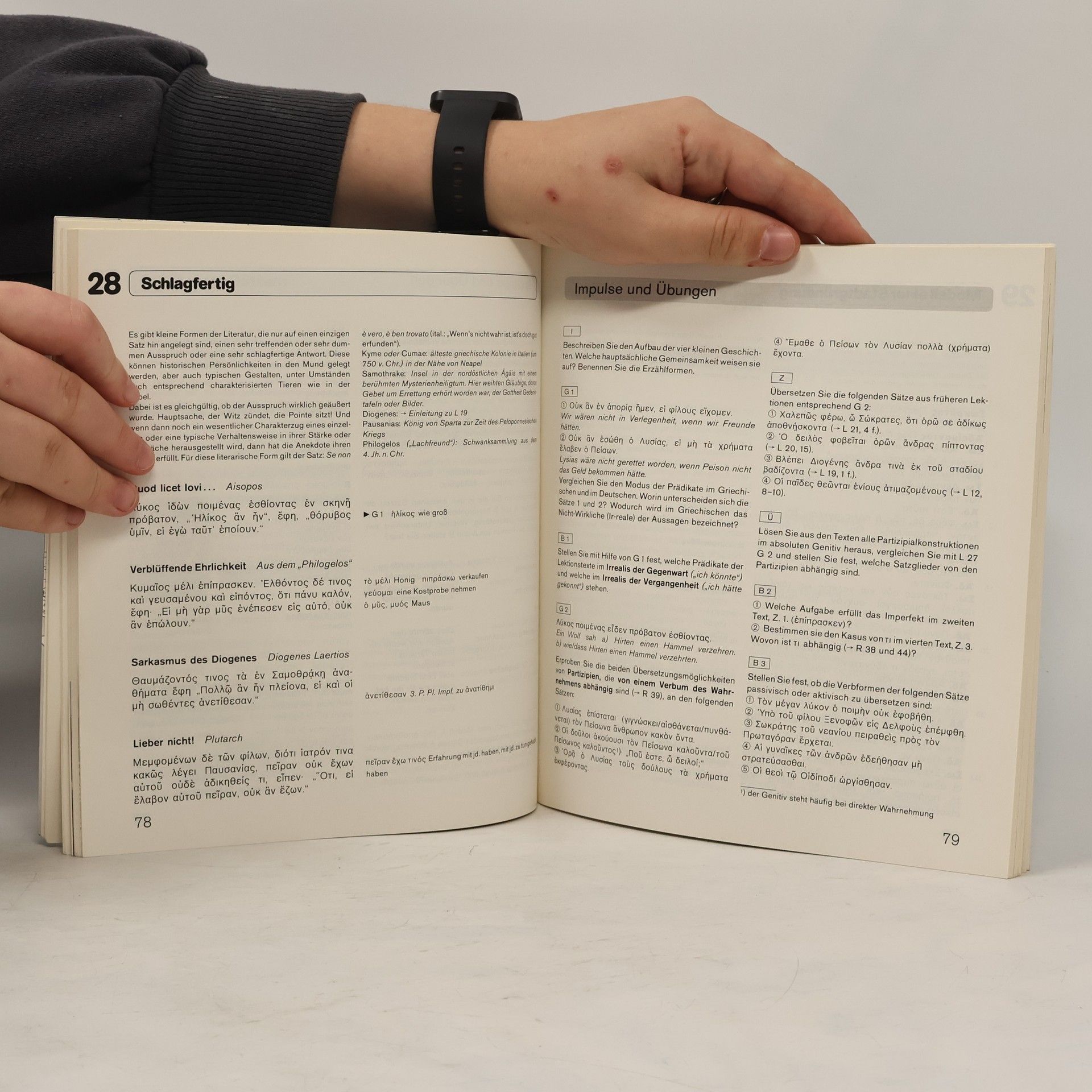 Jetzt Von der 1. Lektion an bietet Kantharos lesenswerte Abschnitte aus antiken Autoren, aus verschiedenen Bereichen und Epochen der griechischen Literatur; Platon und Xenophon und die Philosophie finden breite Berücksichtigung. Die Texte sind zu Anfang behutsam adaptiert und bieten nach und nach immer konsequenter den überlieferten Originalzustand. In jedem Lektionstext wird eine kurze Einführung in den Textzusammenhang (zu Autor, historischer Situation usw.) gegeben. Kantharos ist für alle Zielgruppen von Griechisch-Beginnern (9. Klasse/11. Klasse; Universitätskurse) konzipiert. Kantharos enthält 50 Basislektionen und 9 Zusatzlektionen mit vielfältigem Übungsmaterial; 9 zwischengeschalteten Informationskapiteln zu Sachthemen; einem Textanhang mit 38 Texten von Homer bis Romanos als Ergänzungs- oder Übergangslektüre; dem alphabetischen Verzeichnis des Lernvokabulars; zahlreichen, teils vierfarbigen Abbildungen. Der eine Lektion – ein Schwerpunktpensum; Die Ü reichhaltig und vielfältig; Themenbezogene Bebilderung; "Themenkapitel" vermitteln Hintergrundinformationen zur griechischen Gesellschaft.
