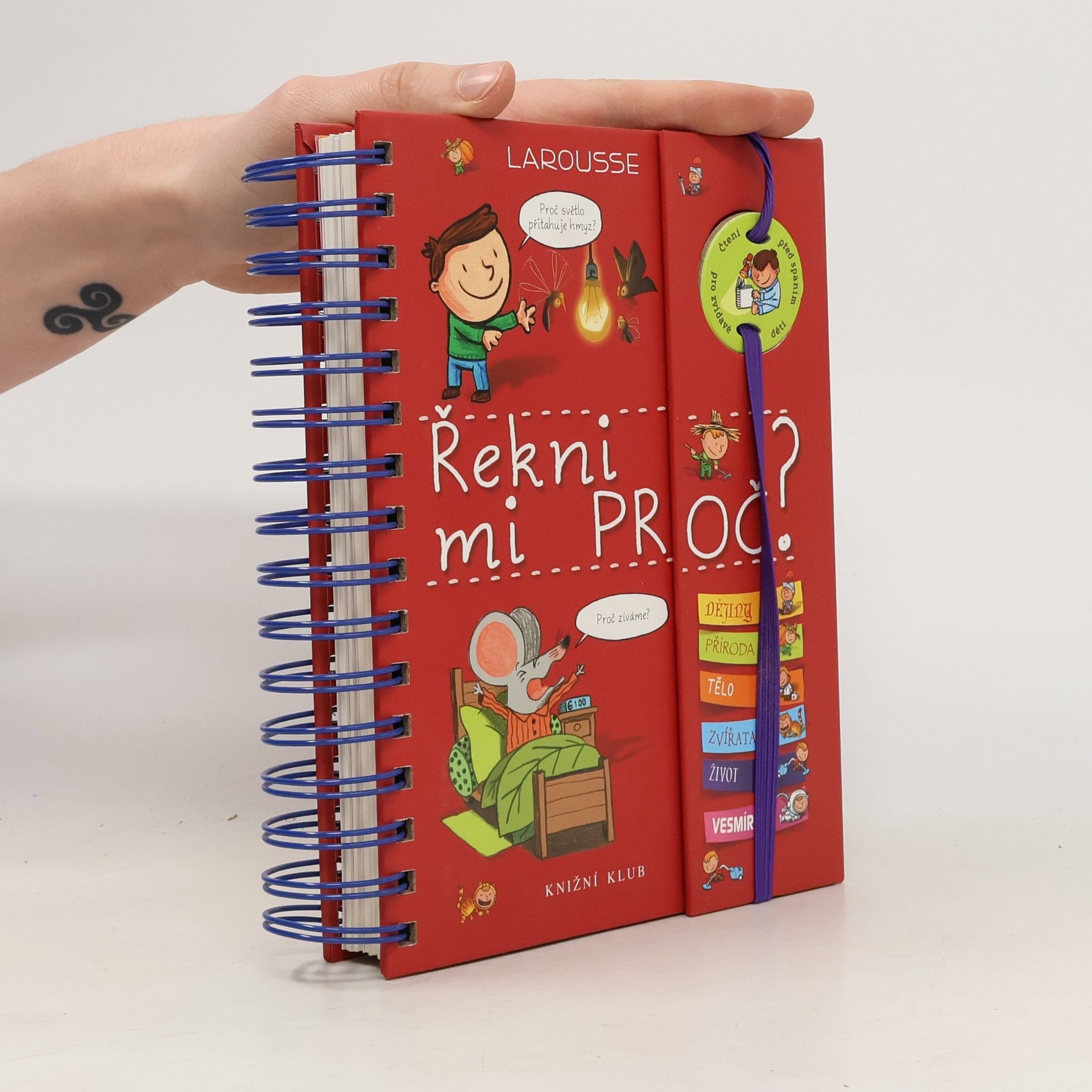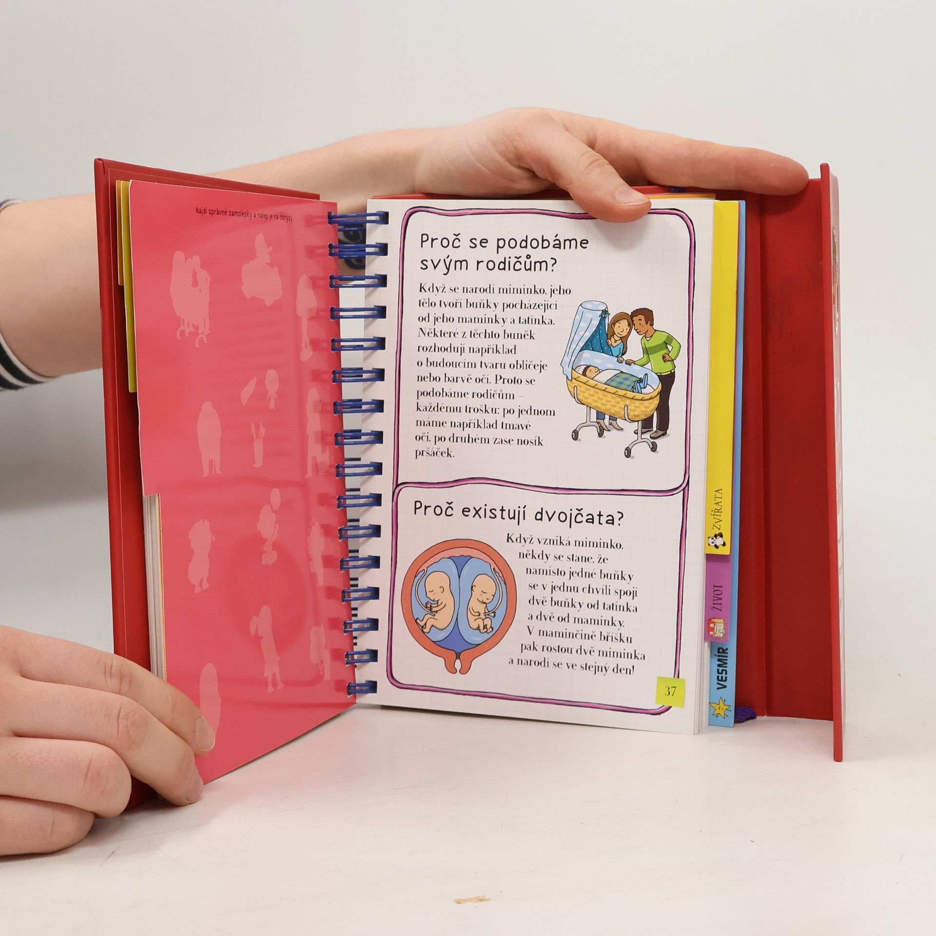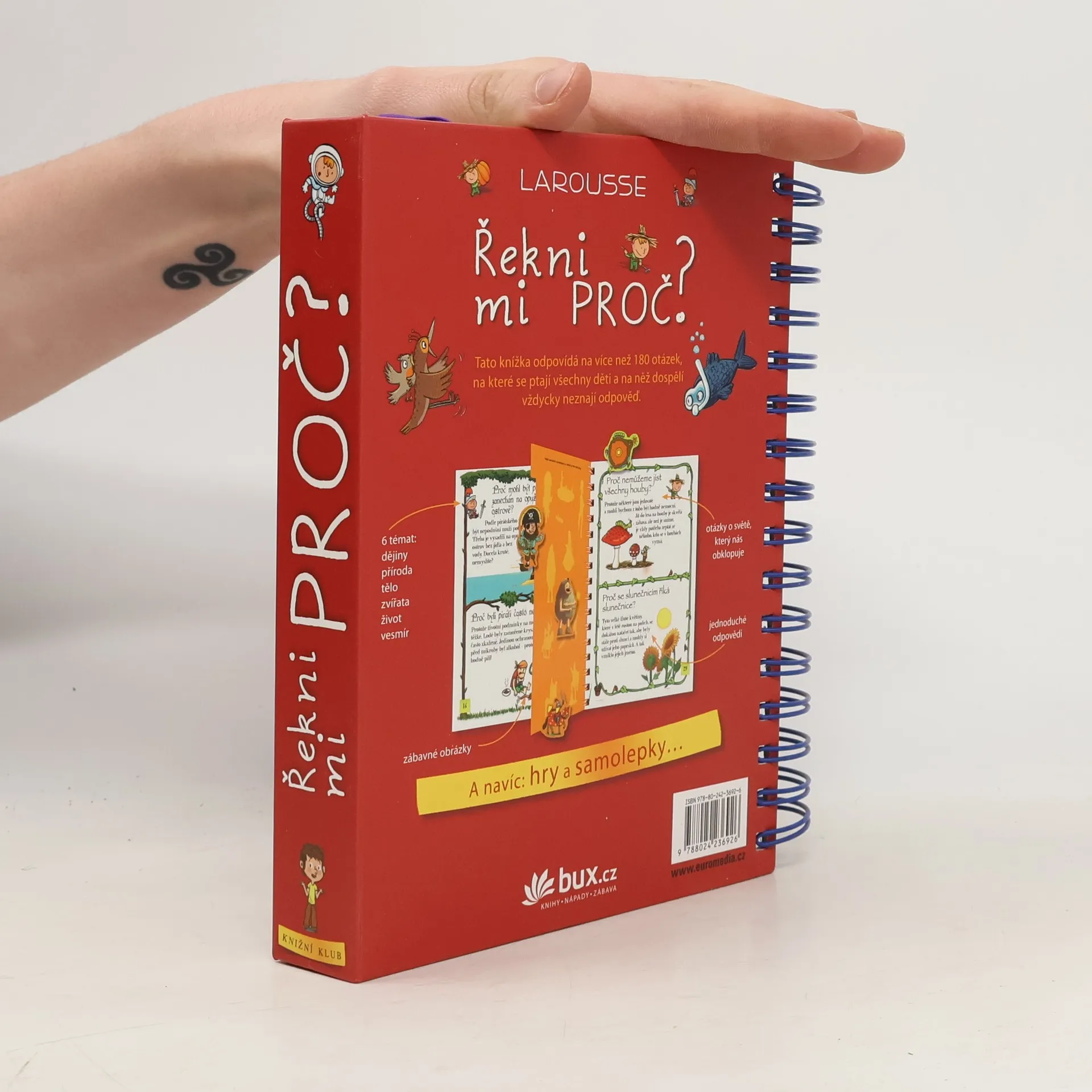 Knížka v kroužkové vazbě má 118 stránek a nacházejí se v ní odpovědi na 180 běžných dětských otázek. Jsou seřazené podle témat do šesti oblastí: dějiny, příroda, lidské tělo, zvířata, život a vesmír. Dozvíte se například, proč je nebe modré, proč Egypťané stavěli pyramidy, proč chodíme do školy, proč se potíme, proč kočky předou a spoustu, spoustu dalšího. Každou tematickou kapitolu navíc doplňují kvízy a samolepky.