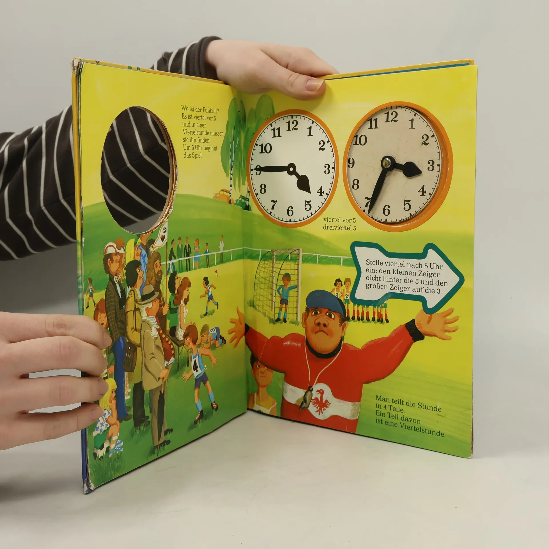 In Peters Tageslauf hat alles seine Zeit. Die kann man auf der ausgestanzten Uhr mit den drehbaren Zeigern einstellen.