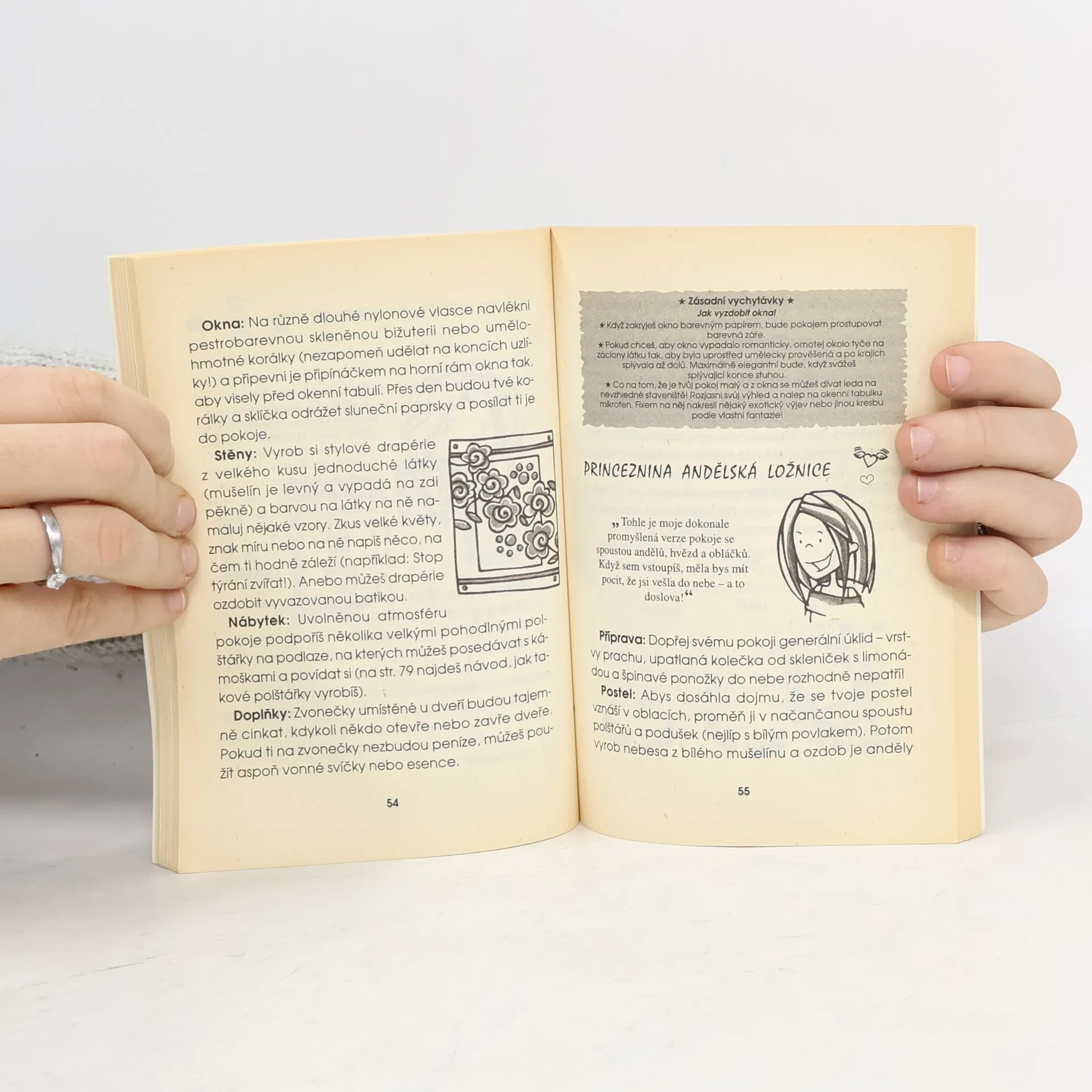Svět správných holek poradí jak si stylově, účelně a nápaditě zařídit pokoj, sladit barvy a zachovat vkus. Pro starší dívky. Pokud rozhodnutí o nutnosti změny ve vašem pokoji už padlo, nahlédněme nejdříve do rozvrhu slečny Rozumné a sestavme vlastní harmonogram postupu práce. Po této generální přípravě, malování a šoupání nábytkem přistupme k fázi nápadů, plánů a náčrtků. Nezapomeňme, že náš styl hodně vypovídá o naší osobnosti!! Správný výběr barvy, ušít si sama nějaký polštářek, nic není problém. V této fázi už klidně zvládneme i sestrojení konstrukce na postel s nebesy. Na závěr se v knize inspirujme deseti oblíbenými pokojovými styly správných holek.