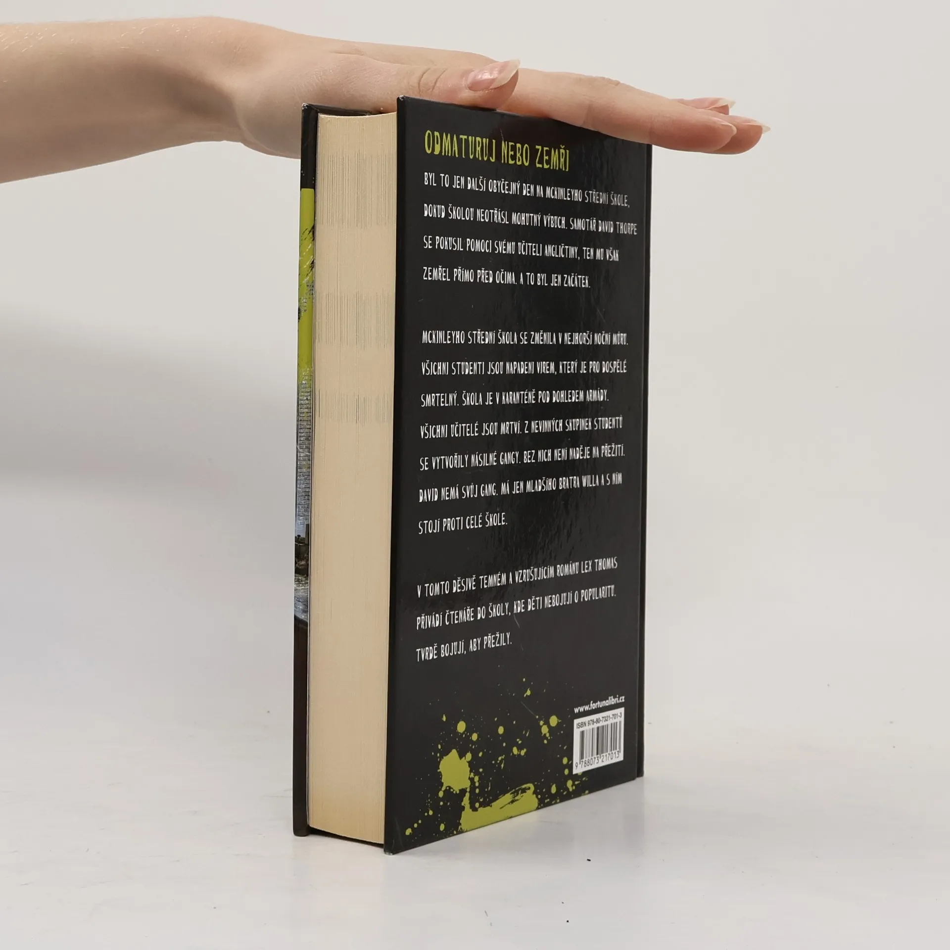 Odmaturuj, nebo zemři! Byl to jen další obyčejný den na McKinleyho střední škole. Dokud školou neotřásl mohutný výbuch. Samotář David Thorpe se pokusil pomoci svému učiteli angličtiny. Ten mu však zemřel přímo před očima. A to byl jen začátek. McKinleyho střední škola se změnila v nejhorší noční můru. Všichni studenti jsou napadeni virem, který je pro dospělé smrtelný. Škola je v karanténě pod dohledem armády. Všichni učitelé jsou mrtví. Z nevinných skupinek studentů se vytvořily násilné gangy. Bez nich není naděje na přežití. David nemá svůj gang. Má jen mladšího bratra Willa a s ním stojí proti celé škole. V tomto děsivě temném a vzrušujícím románu Lex Thomas přivádí čtenáře do školy, kde děti nebojují o popularitu. Tvrdě bojují, aby přežily. -- 1. vydání.