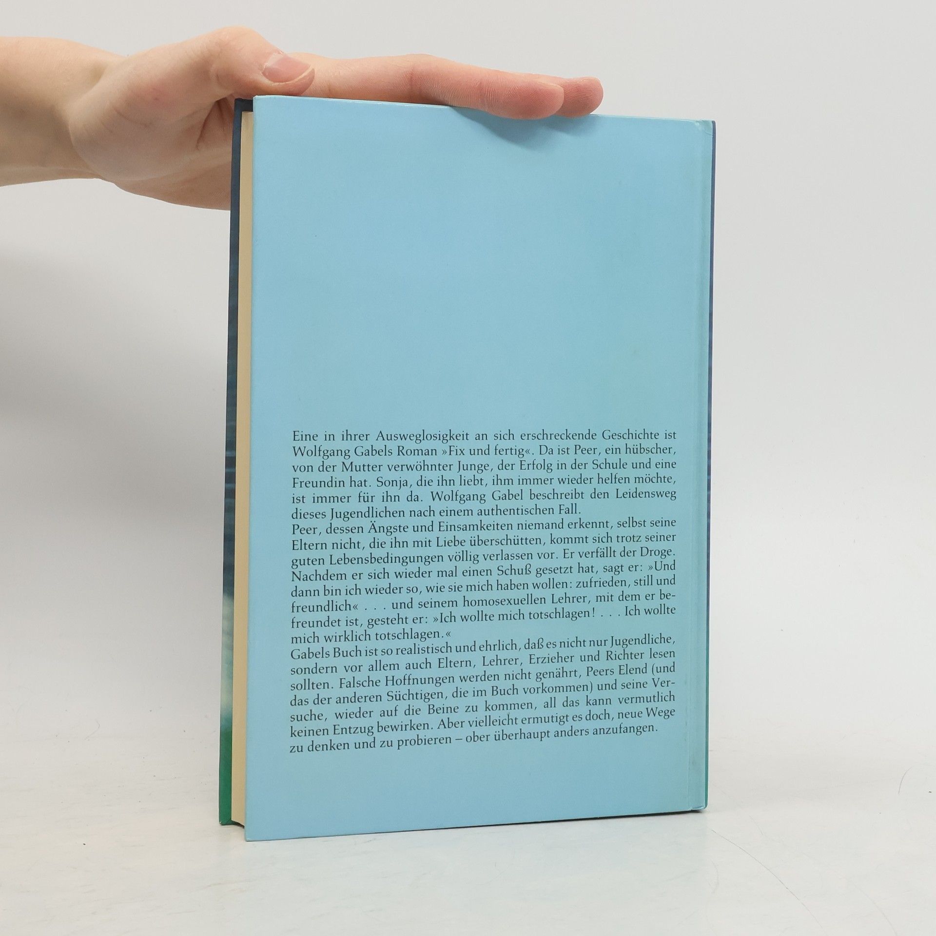 Peer könnte es eigentlich nicht besser gehen. Er sieht gut aus, ist Klassenbester, hat eine Freundin und bekommt von seinen Eltern alles, was er will. Doch innen bleibt er leer. Ständige Kopfschmerzen bringen ihn auf Tabletten, dann kommt Haschisch und schließlich Heroin. Mehrere Entziehungskuren und dazwischen Rückfälle: Wolfgang Gabel spart nichts aus, wenn es darum geht, darzustellen, wie die Würde, die Ehre und die Moralbegriffe verloren gehen im täglichen Kampf um den Stoff.