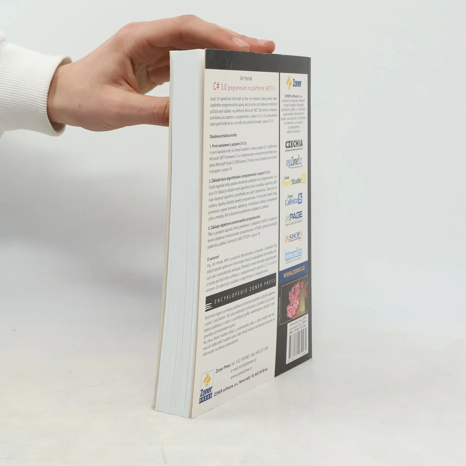 Jazyk C# společnosti Microsoft si za léta své existence vybudoval pověst úspěšného programovacího jazyka pro moderní aplikace na platformě Microsoft .NET. Tato kniha je určena zájemcům o programování v jazyce C# 3.0 a po jejím prostudování se čtenáři stanou pokročilými vývojáři. První kapitola představuje evoluci jazyka C# 3.0, platformu Microsoft .NET Framework 3.5 a integrované vývojové prostředí Microsoft Visual C# 2008 Express. Čtenáři se naučí sestavit svůj první funkční program a pochopí jeho fungování. Druhá kapitola nabízí teoreticko-praktický kurz programování, začínající teorií algoritmů, která vysvětluje jejich vlastnosti a reprezentaci. Dále se probírají datové typy, proměnné, typové konverze, operátory, rozhodovací příkazy, cykly a metody, vše doplněné praktickými příklady. Třetí kapitola se zaměřuje na základní pilíře objektově orientovaného programování (OOP) a ukazuje jejich aplikaci v jazyce C# 3.0. Autor, Ing. Ján Hanák, MVP, je vysokoškolský pedagog na Ekonomické univerzitě v Bratislavě, kde přednáší programování a vývoj softwaru v jazycích C, C++ a C#. Je autorem 20 odborných publikací o algoritmizaci a programování.