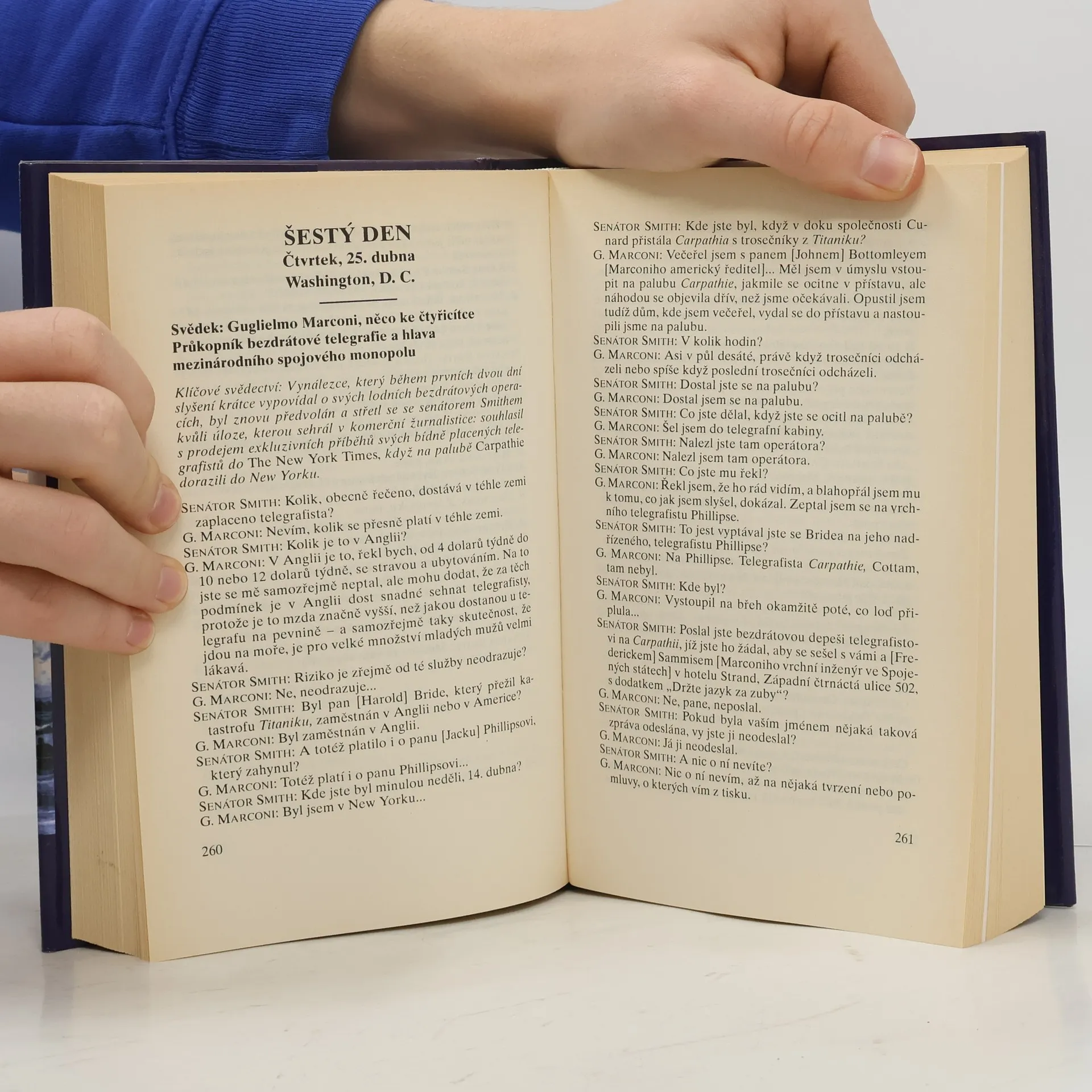 Kniha je přepisem výpovědí při vyšetřování Senátem z roku 1912. Jsou zde výpovědi: J. Bruce Ismaye, provozního ředitele White Star Line, Arthura Henryho Rostrona, kapitána Carpathie, Charlese Lightollera, II. důstojníka Titaniku a dalších, jež nešťastnou událost přežili.