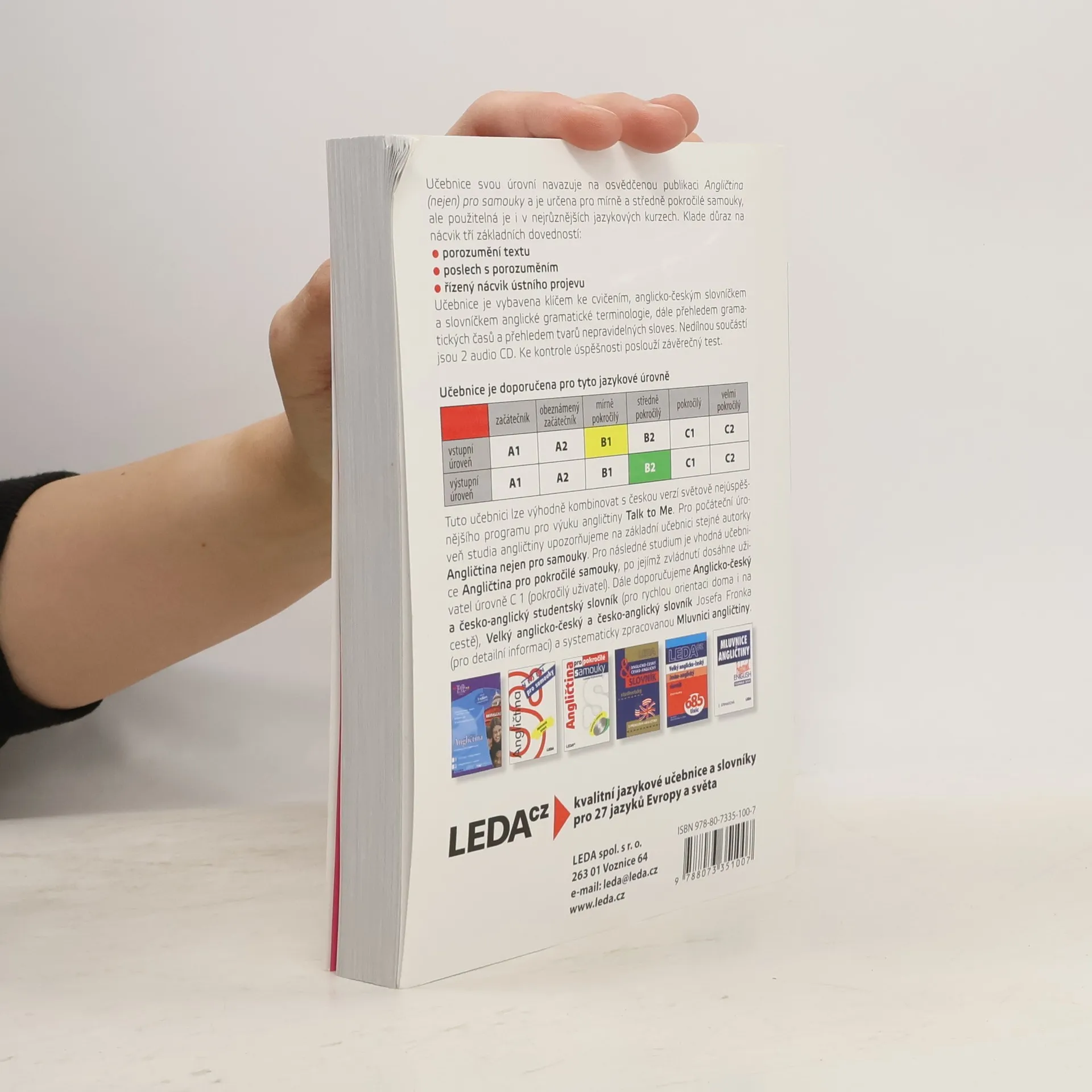 Učebnice, která svou úrovní navazuje na osvědčenou publikaci Angličtina (nejen) pro samouky, je určena nejen samoukům, ale je použitelná i v nejrůznějších anglických kurzech. Učebnice je zaměřena na nácvik tří základních dovedností – porozumění textu, poslech s porozuměním a řízený nácvik ústního projevu na takové úrovni, která uživatelům po zvládnutí učiva zaručí dosažení stupně pokročilosti B2 podle doporučení Rady Evropy. Součástí učebnice je klíč ke cvičením, anglicko-český slovníček a slovníček anglické gramatické terminologie.