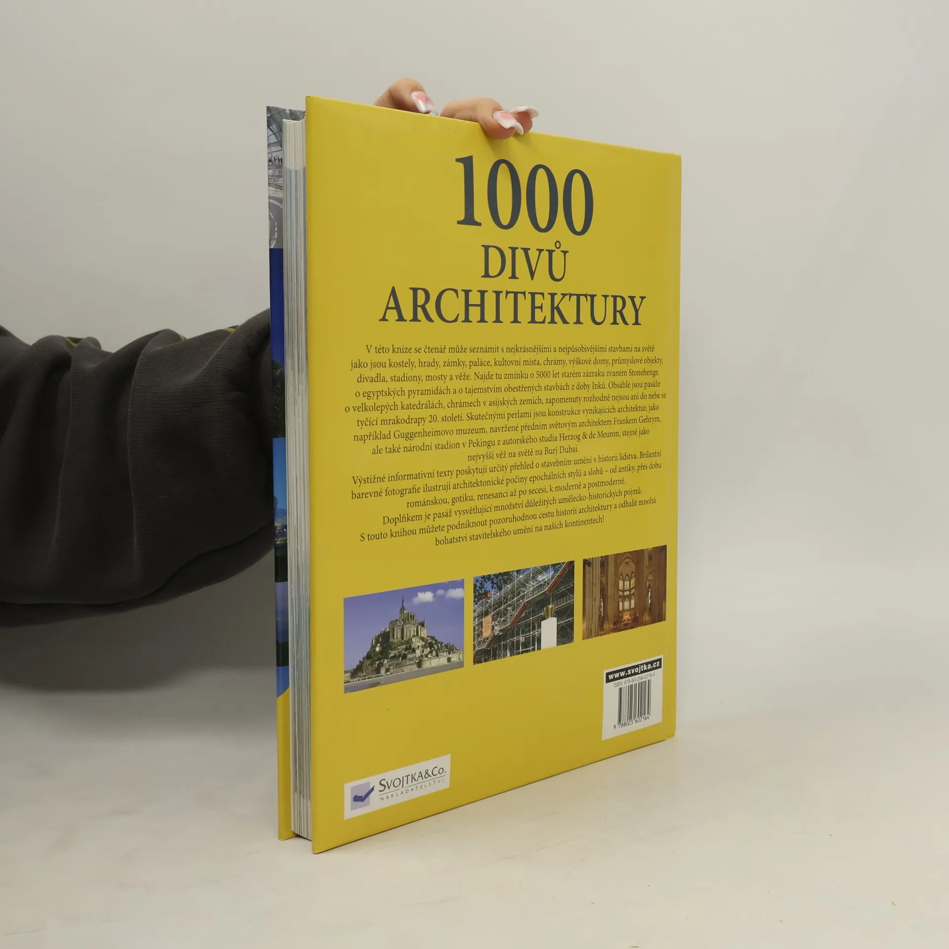 V knize Tisíc divů architektury se můžete seznámit s nejkrásnějšími a nejpůsobivějšími stavbami na světě, jako jsou kostely, hrady, zámky, paláce, kultovní místa, chrámy, výškové budovy, průmyslové objekty, divadla, stadiony, mosty a věže. Najdete tu např. zmínku o 5000 let starém stavitelském zázraku zvaném Stonehenge, o eyptských pyramidách či o tajemstvím obestřených stavbách říše Inků. Obsáhlé jsou pasáže o velkolepých katedrálách, chrámech v asijských zemích, zapomenuty rozhodně nejsou ani do nebe se tyčící mrakodrapy 20. stolení. Výstižné informativní texty poskytují ucelený přehled o stavebním umění v historii lidstva. Brilantní barevné fotografie ilustrují architektonické počiny epochálních stylů a slohů - od antiky přes dobu románskou, gotiku, renesanci až po secesi, k moderně a postmoderně. Doplňkem je pasáž vysvětlující množství důležitých umělekco-historických pojmů. S touto knihou můžete podniknout pozoruhodnou cestu historií architektury a odhalit bohatství stavitelského umění na všech kontinentech!