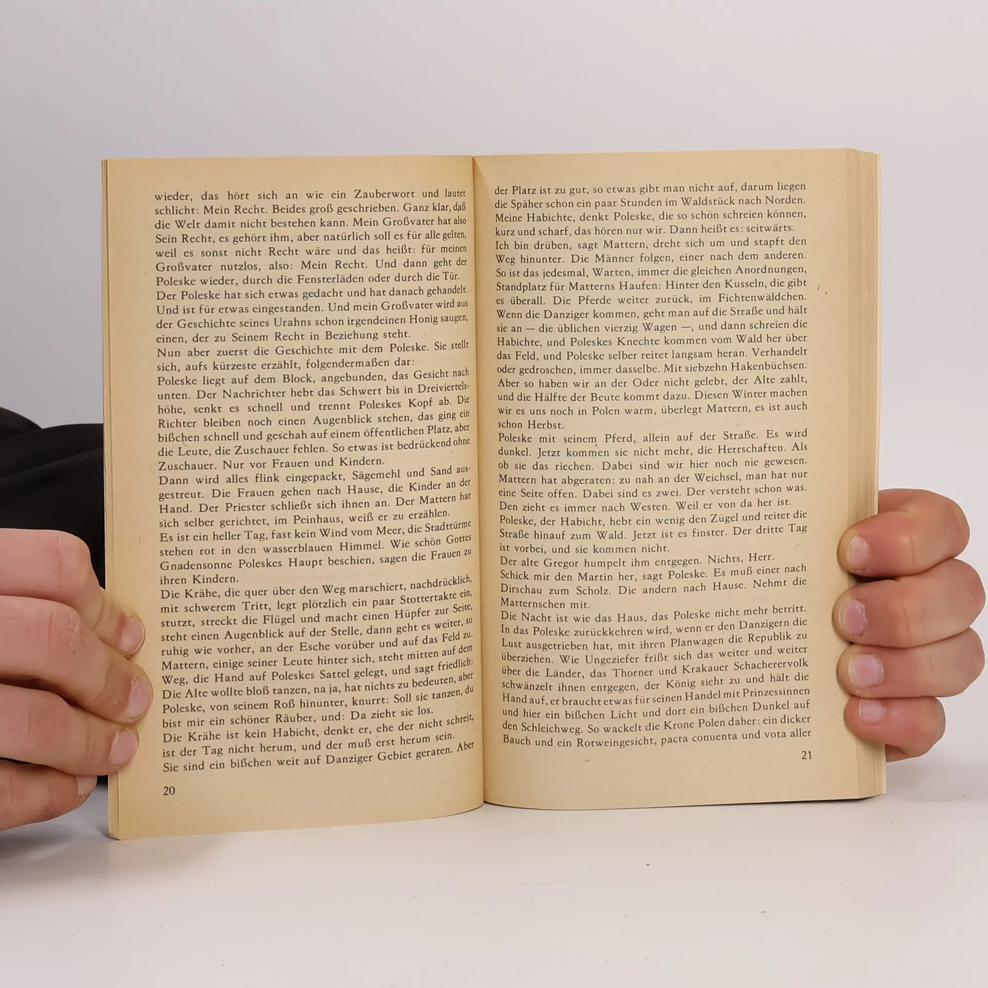 Bobrowski hat seinen Roman im Westpreußen von 1874, im Kaiserreich, nicht weit von Thorn, angesiedelt. Er erzählt uns von der sehr besonderen Landschaft, von den Wiesen, den Wäldern und den Flüssen; er erzählt von den Tieren dort, den Pferden, den Schweinen und den Vögeln, die allein in unzähligen Arten vorkommen, seien es zarte Schwalben oder fette Gänse. Und er erzählt von den Menschen. Da sind die katholischen Polen, Juden, Zigeuner mit Geige, Vaganten, Kossäten, und natürlich die Deutschen, Baptisten, Adventisten, Methodisten. Ein lebhaftes Durcheinander. Die Geschichte, um die es geht, ist einfach: Der Großvater des Erzählers, Mühlenbesitzer und Deutscher, von dem es heißt, er leide an der Galle, hat das Wasser gestaut und dann die Mühle seines Konkurrenten, des Juden Levin, der wiederum am Herzen leidet, weggespült. Und weil sich der Levin das nicht gefallen lassen will, klagt er vor Gericht in der Stadt. In gemütlichem Tonfall erfahren wir diese spannungsgeladene Geschichte. Schnell sind wir mittendrin, hören den Leuten zu, so wie sie eben reden, maulfaul und redselig zugleich, hören ihren Dialekt und unbekannte, klingende Worte. Vor uns tut sich ein Reichtum an Sprache und Geschichten auf, wie er uns selten begegnet.