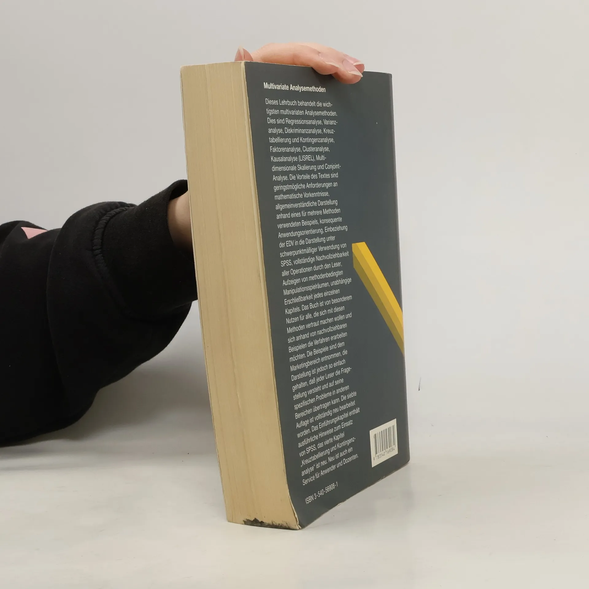 Dieses Lehrbuch behandelt die wichtigsten multivariaten Analysemethoden, dies sind Regressionsanalyse, Varianzanalyse, Diskriminanzanalyse, Kreuztabellierung und Kontingenzanalyse, Faktorenanalyse, Clusteranalyse, Kausalanalyse (LISREL), multidimensionale Skalierung und Conjoint-Analyse. Die Vorteile des Textes sind geringstm gliche Anforderungen an mathematische Vorkenntnisse, allgemeinverst ndliche Darstellung anhand eines f r mehrere Methoden verwendeten Beispiels, konsequente Anwendungsorientierung, Einbeziehung der EDV in die Darstellung unter schwerpunktm iger Verwendung von SPSS, vollst ndige Nachvollziehbarkeit aller Operationen durch den Leser, Aufzeigen von methodenbedingten Manipulationsspielr umen, unabh ngige Erschlie barkeit jedes einzelnen Kapitels. Das Buch ist von besonderem Nutzen f r alle, die sich mit diesen Methoden vertraut machen wollen und sich anhand von nachvollziehbaren Beispielen die Verfahren erarbeiten m chten. Die Beispiele sind dem Marketingbereich entnommen, die Darstellung ist jedoch so einfach gehalten, da jeder Leser die Fragestellung versteht und auf seine spezifischen Probleme in anderen Bereichen bertragen kann. Die siebte Auflage ist vollst ndig neu bearbeitet worden. Das Einf hrungskapitel enth lt ausf hrliche Hinweise zum Einsatz von SPSS, das vierte Kapitel "Kreuztabellierung und Kontingenzanalyse" ist neu. Neu ist auch ein Service f r Anwender und Dozenten.
