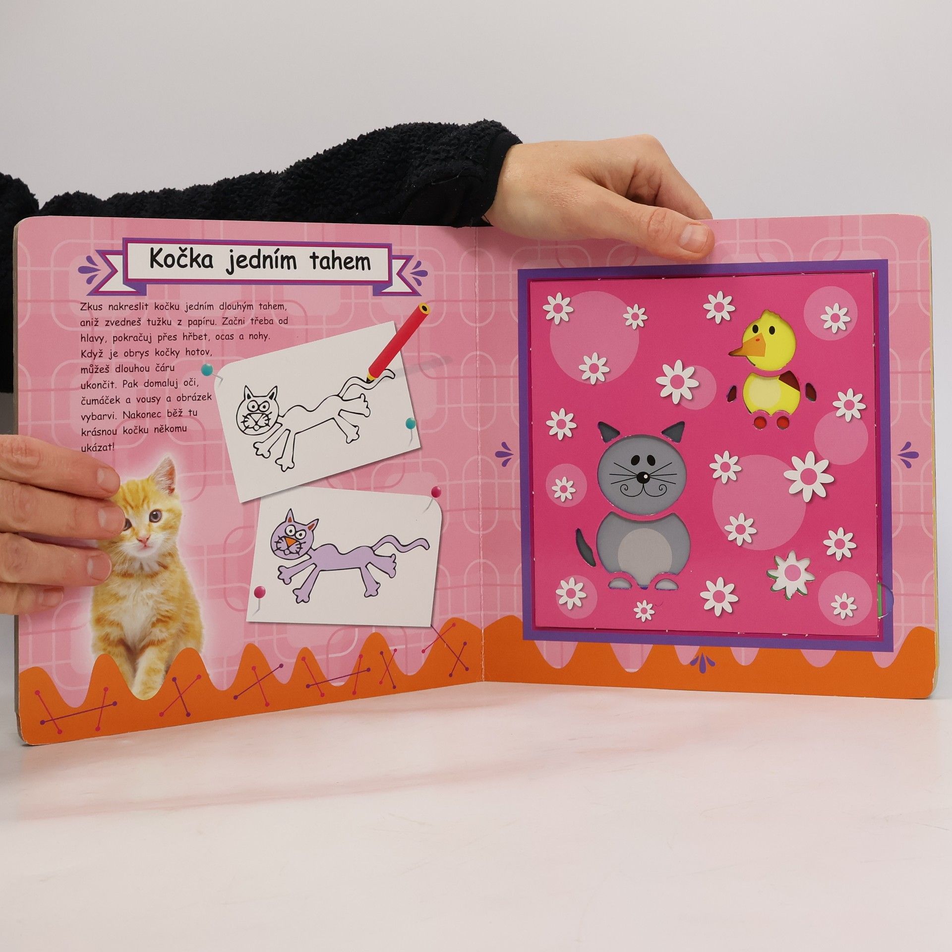 Knížka Kočičky ukáže dětem, jak správně nakreslit tato zvířátka. Pomocí snadno vyjímatelných šablon mohou malí kreslíři vystihnout přesný obrys obrázku a pak jej stačí jen vybarvit. Kromě šablon kniha obsahuje spoustu zajímavých informací o zvířátkách, hádanky a další jednoduché návody na kreslení.
