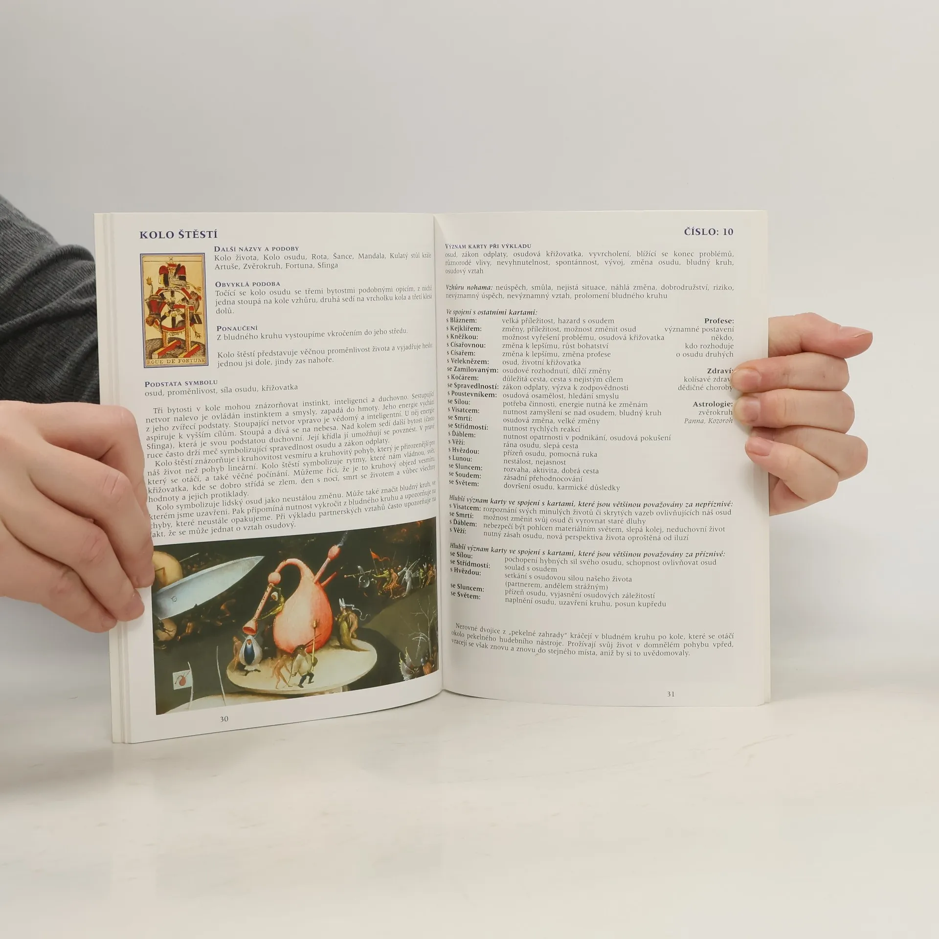 Kniha se zaměřuje na význam karet Velké arkány a jejich vzájemné souvislosti ve výkladu. Autor používá detaily z obrazu „Zahrada pozemských rozkoší“ Hieronyma Bosche k vysvětlení symbolů tarotu. Závěr obsahuje různé metody vykládání, ilustrované příklady otázek a konkrétních výkladů. Dále se kniha dotýká vztahu tarotu a psychologie C. G. Junga. Symboly karet Velkých arkán slouží jako ukazatele na naší životní cestě, varující před nebezpečím nebo potvrzující správnost rozhodnutí. Rozluštění významu Boschových obrazů je náročné, přičemž dosud žádná teorie nebyla uspokojivě potvrzena. Srovnání těchto obrazů a symbolů tarotu může odhalit jejich tajemství. Jung viděl v alchymii paralelu k procesům v duši, přičemž alchymistické symboly se objevují i v Boschově díle. Obsah knihy zahrnuje témata jako nahlížení do budoucnosti, význam Velké arkány, kombinace karet, různé výkladové metody, a také psychologické aspekty individuace a vnitřního rozvoje. Kniha tak nabízí hlubší pohled na propojení tarotu, umění a psychologických procesů, které ovlivňují naše životy.