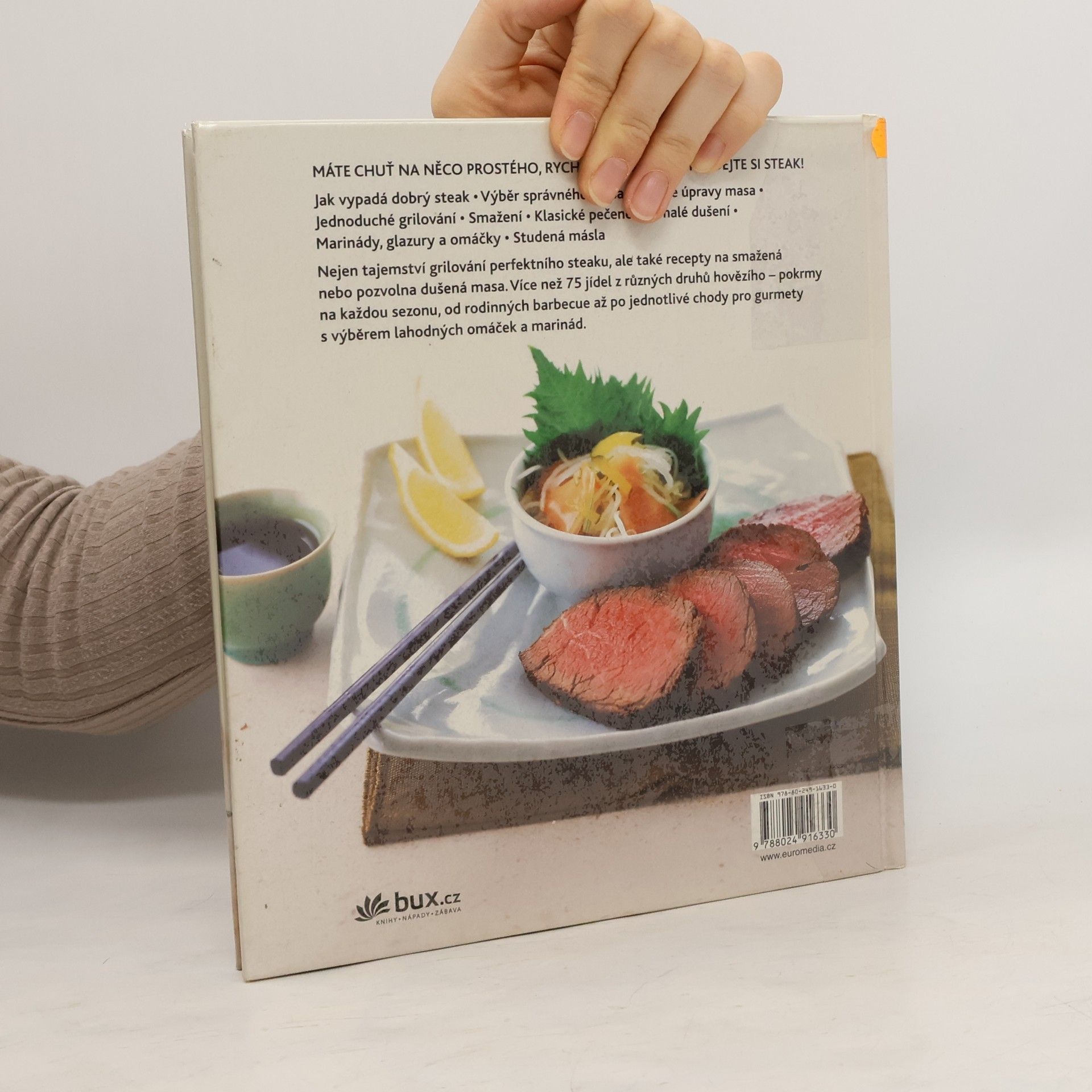 Od T-bone steaku přes chateaubriand pečený v solné krustě až k filetu mignon se šalotkou. Máte chuť na něco prostého, rychlého a snadného? Všechny tyto atributy splňuje steak! Není to vůbec obtížné: naučíte se vybrat správně maso, odhadnout stupeň propečení, dobře grilovat, smažit či připravit klasické pečeně. Více než 75 jídel z různých druhů hovězího pokrmy na každou sezonu, od rodinných barbecue až po jednotlivé chody pro gurmety s výběrem lahodných omáček, marinád i studených ochucených másel.