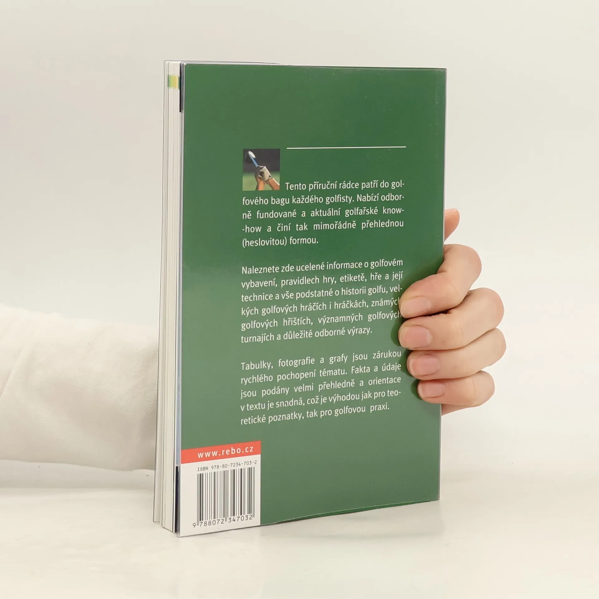 Tento příruční rádce patří do golfového bagu každého golfisty. Nabízí odborně fundované a aktuální golfařské know-how a činí tak mimořádně přehlednou (heslovitou) formou. Naleznete zde ucelené informace o golfovém vybavení, pravidlech hry, etiketě, hře a technice hry a vše podstatné o historii golfu, velkých golfových hráčích i hráčkách, známých golfových hřištích, významných golfových turnajích a důležité odborné výrazy. Tabulky, fotografie a grafy jsou zárukou rychlého pochopení tématu. Fakta a údaje jsou podány velmi přehledně a orientace v textu je snadná, což je výhodou jak pro teoretické poznatky, tak pro golfovou praxi.