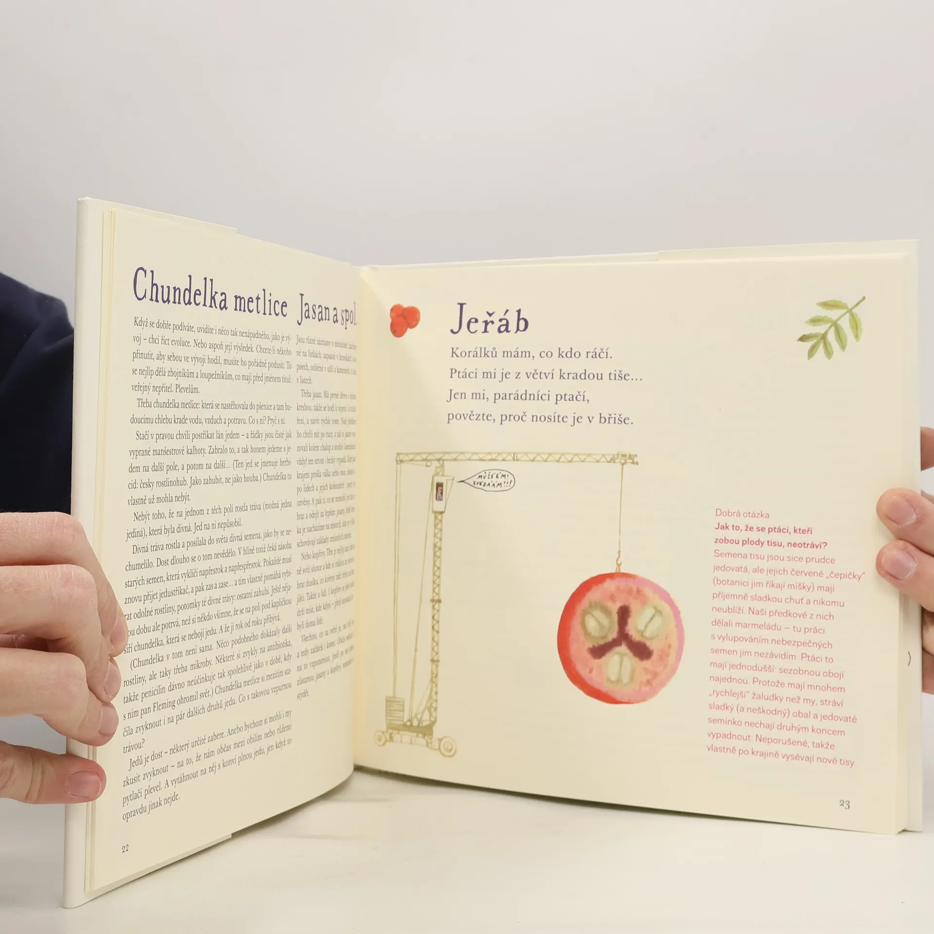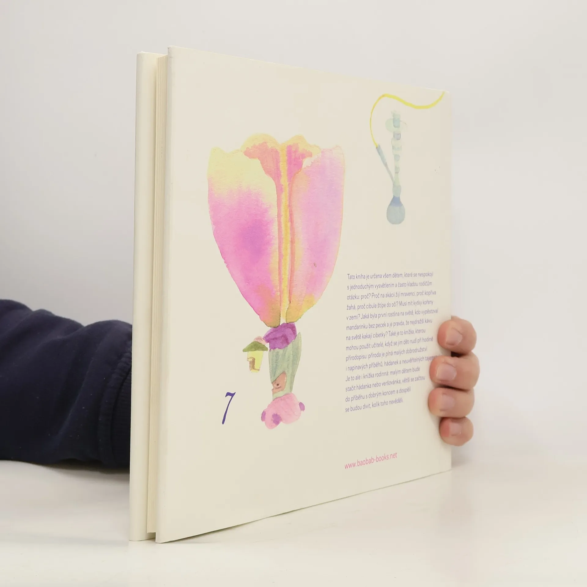 Tato kniha je určena všem dětem, které se nespokojí s jednoduchým vysvětlením a často kladou rodičům otázku proč. Proč na akátu žijí mravenci, proč kopřiva žahá, proč cibule štípe do očí a proč musí mít kytky kořeny v zemi? Jaká byla první rostlina na světě, kdo vypěstoval sladký hrášek a je pravda, že nejdražší kávu na světě kakají cibetky? Rostlinopis v podání Jiřího Dvořáka a Alžběty Skálové mohou také použít učitelé, když se děti při vyučování přírodopisu nudí: příroda je plná malých napínavých dobrodružství i hrdinných příběhů, hádanek a neuvěřitelných tajemství. A v neposlední řadě je to i knížka rodinná: malým dětem bude stačit hádanka nebo veršovánka, větší děti se začtou do příběhu s dobrým koncem a dospělí se budou divit, kolik toho nevěděli.