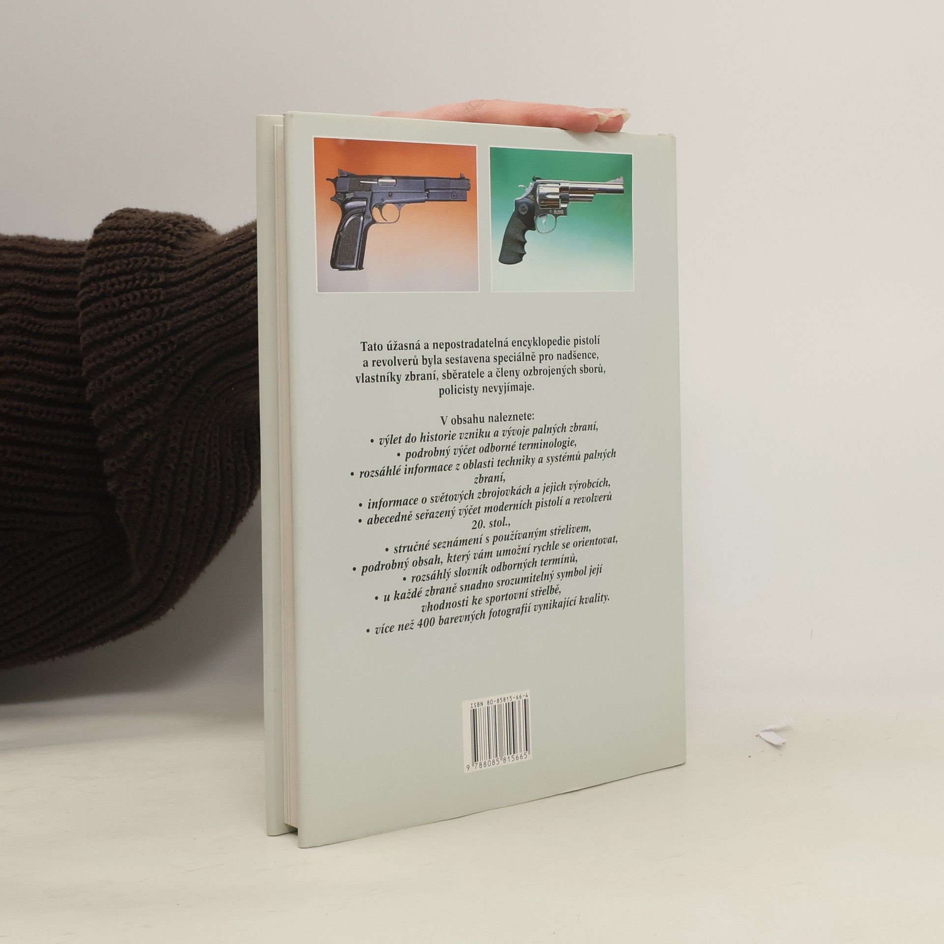 Tato úžasná a nepostradatelná ecyklopedie pistolí a revorverů byla sestavena speciálně pro nadšence, vlastníky zbraní, sběratele a členy ozbrojených sborů, policisty nevyjímaje. V prvních kapitolách je stručné uveden vývoj palných zbraní. Kniha se detailně zabývá současnou terminologií zbraní a také bezpečností jejich užívání. Největší část knihy je věnována technickým údajům současných, ve světě vyráběných pistolí a revorverů, rozdělených podle typu a modelu. Je doplněna více než 400 barevných fotografiemi vysoké kvality. Profesionál v oboru zbraní se bez této knihy neobejde. Neměla by chybět ani na žádném oddělení policie.