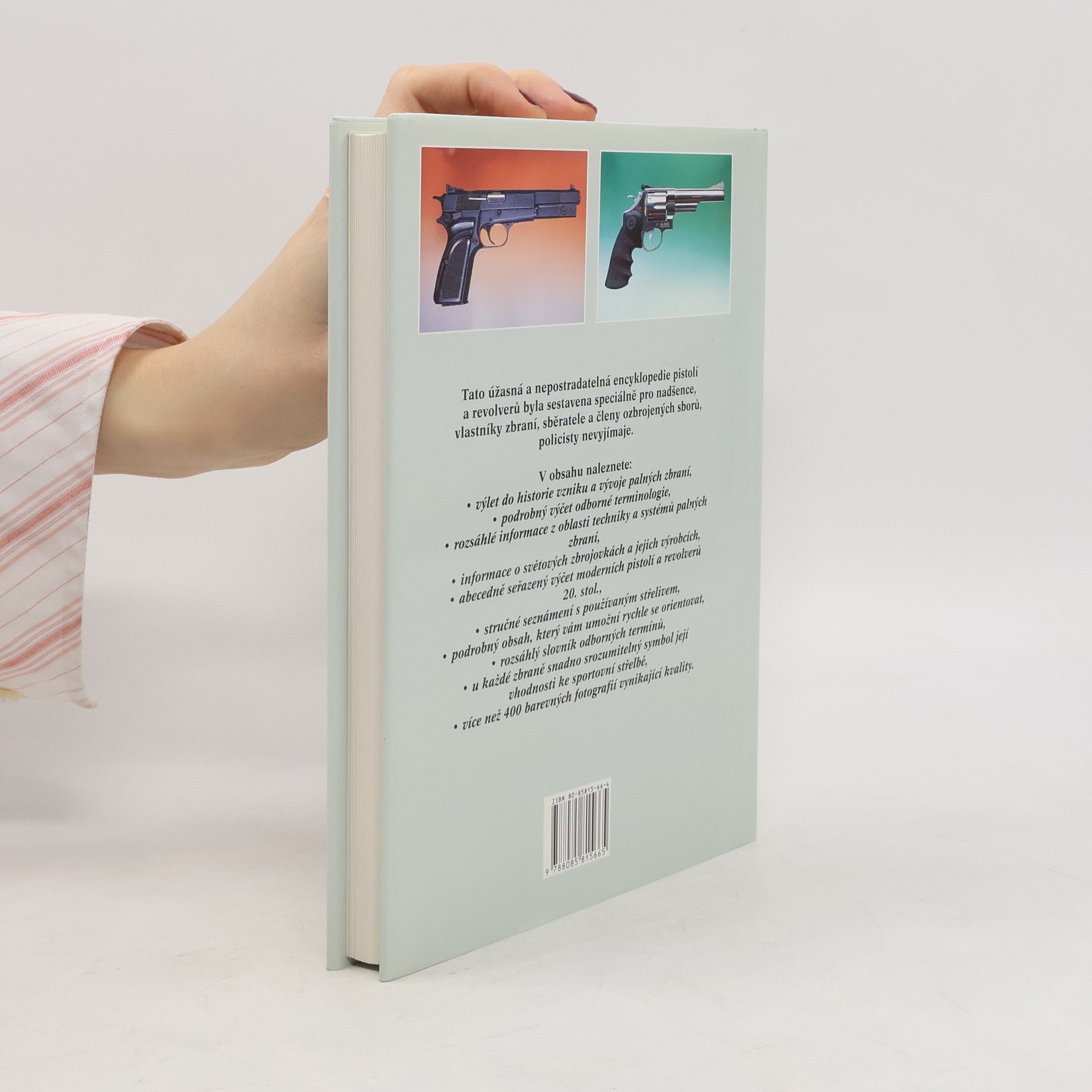 Tato úžasná a nepostradatelná ecyklopedie pistolí a revorverů byla sestavena speciálně pro nadšence, vlastníky zbraní, sběratele a členy ozbrojených sborů, policisty nevyjímaje. V prvních kapitolách je stručné uveden vývoj palných zbraní. Kniha se detailně zabývá současnou terminologií zbraní a také bezpečností jejich užívání. Největší část knihy je věnována technickým údajům současných, ve světě vyráběných pistolí a revorverů, rozdělených podle typu a modelu. Je doplněna více než 400 barevných fotografiemi vysoké kvality. Profesionál v oboru zbraní se bez této knihy neobejde. Neměla by chybět ani na žádném oddělení policie.