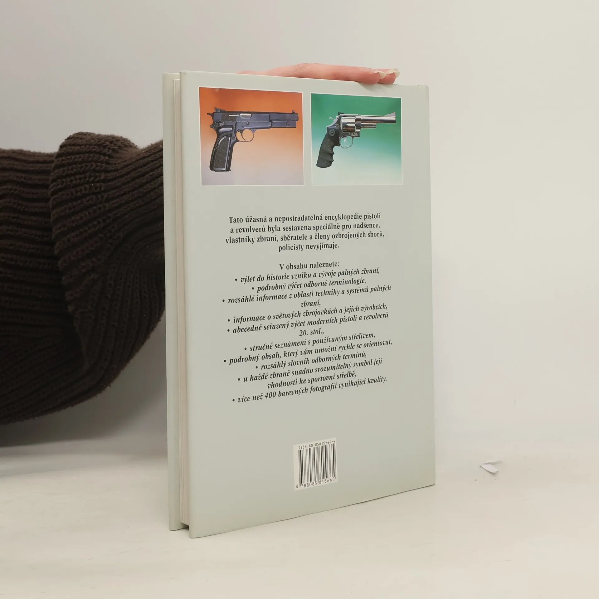 Tato úžasná a nepostradatelná ecyklopedie pistolí a revorverů byla sestavena speciálně pro nadšence, vlastníky zbraní, sběratele a členy ozbrojených sborů, policisty nevyjímaje. V prvních kapitolách je stručné uveden vývoj palných zbraní. Kniha se detailně zabývá současnou terminologií zbraní a také bezpečností jejich užívání. Největší část knihy je věnována technickým údajům současných, ve světě vyráběných pistolí a revorverů, rozdělených podle typu a modelu. Je doplněna více než 400 barevných fotografiemi vysoké kvality. Profesionál v oboru zbraní se bez této knihy neobejde. Neměla by chybět ani na žádném oddělení policie.