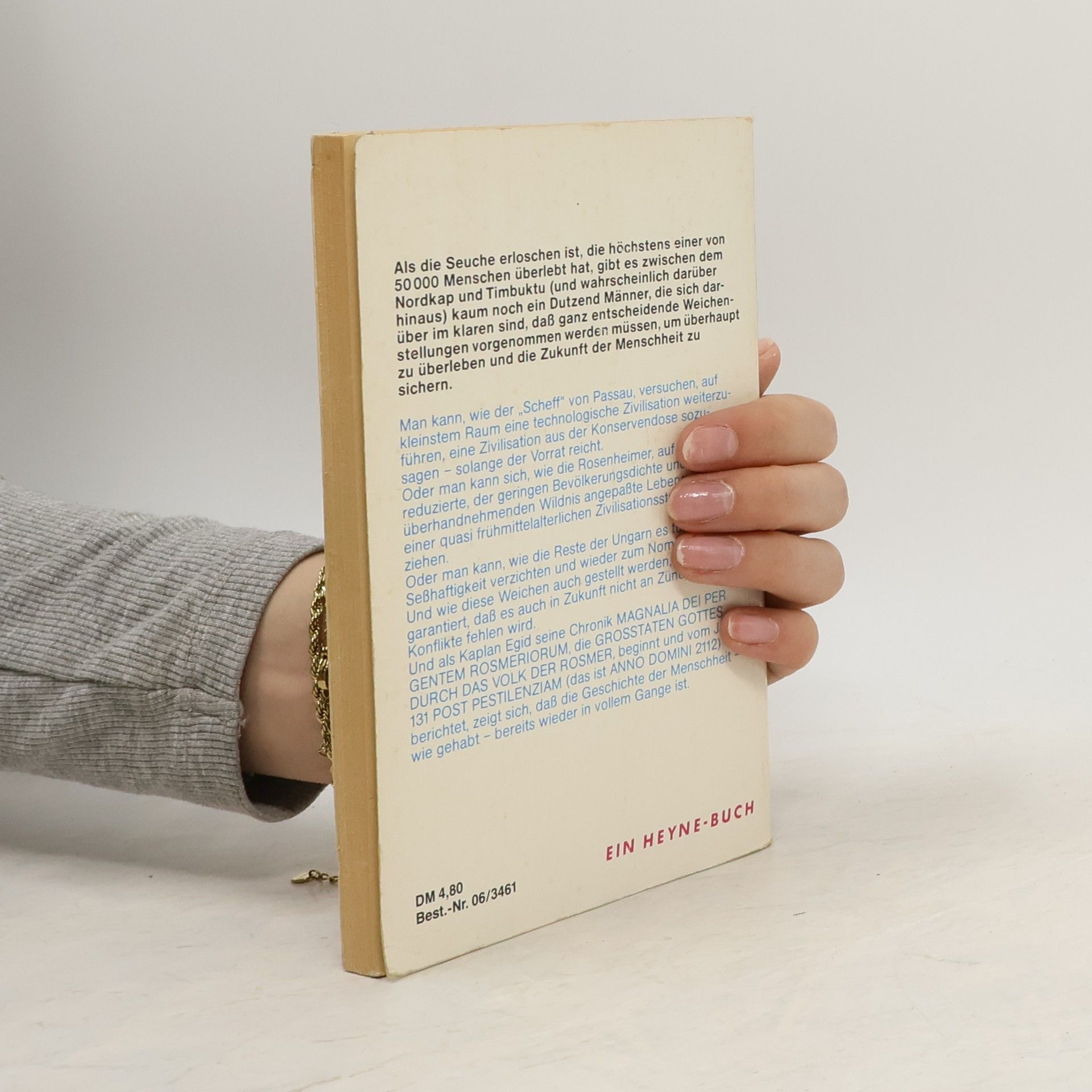 Als die Seuche erloschen ist, die höchstens einer von 50 000 Menschen überlebt hat, gibt es zwischen dem Nordkap und Timbuktu kaum noch ein Dutzend Männer, die sich darüber im klaren sind, dass ganz entscheidende Weichenstellungen vorgenommen werden müssen, um überhaupt zu überleben und die Zukunft der Menschheit zu sichern. Ein Teil davon, wie der „Scheff“ von Passau, die Rosenheimer oder die Ungarn, versuchen auf ganz unterschiedliche Weise, sich den Umständen anzupassen und zu überleben. Und als Kaplan Egid seine Chronik „Der Großtaten durch das Volk der Rosmer“ beginnt, und vom Jahre 131 Post pestilenziam (das ist Anno Domini 2112) berichtet, zeigt sich, dass die Geschichte der Menschheit bereits wieder in vollem Gang ist.