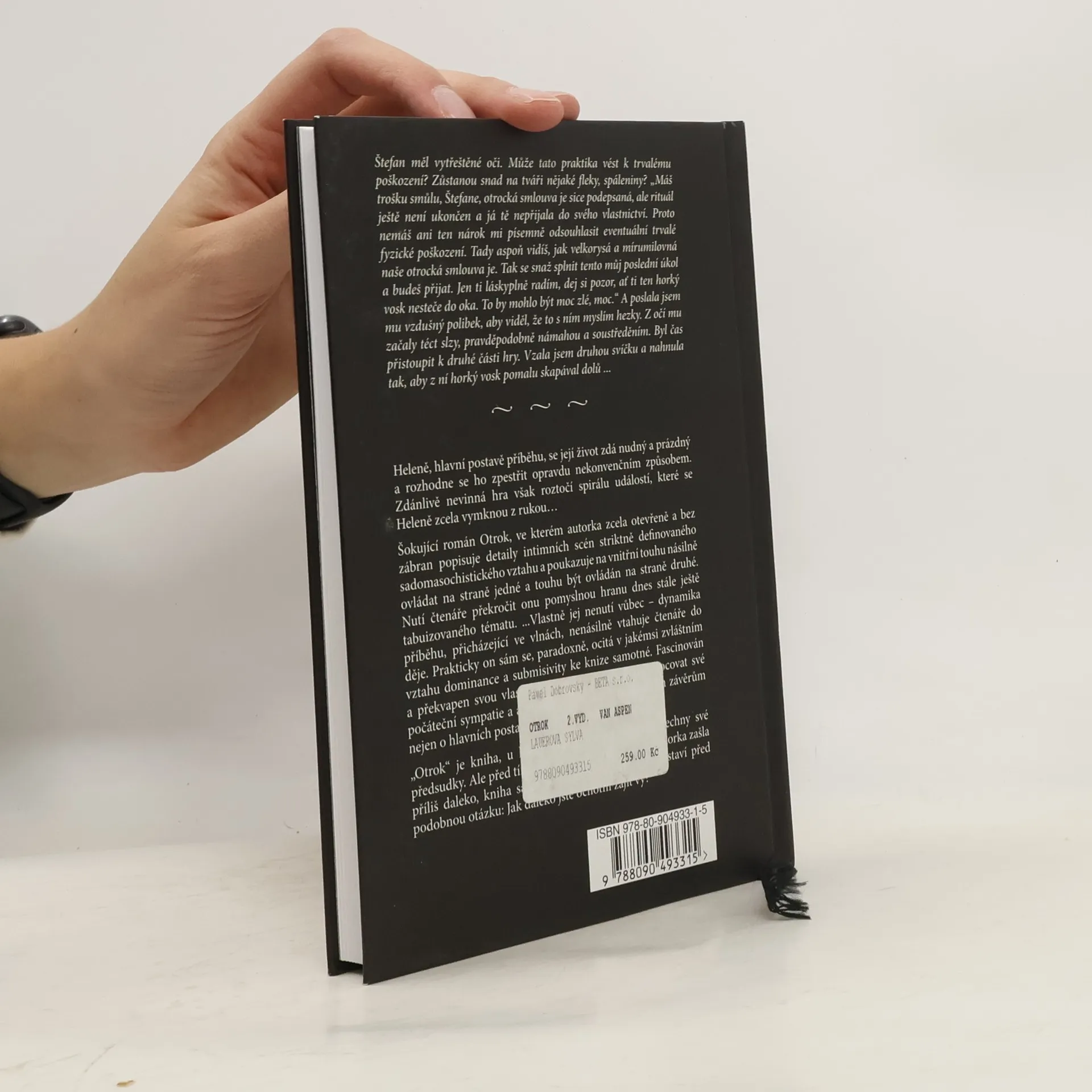 Druhé vydání knihy Otrok reflektuje překvapivě neutuchající zájem čtenářské veřejnosti o šokující román kontroverzní české spisovatelky, kterou je Sylva Lauerová. V Heleně, která je jinak úspěšnou realitní makléřkou, doznívá intenzivní pocit frustrace z dalšího nevydařeného vztahu. Ocitá se poprvé v životě sama, a tak se rozhodne zpestřit svůj svět opravdu nekonvenčním způsobem. Najde si muže - otroka. Zdánlivě nevinná hra však roztočí spirálu událostí, které se Heleně zcela vymknou z rukou… Na pozadí striktně definovaného sadomasochistického vztahu se odvíjí fascinující temné drama, odhalující démona neomezené moci. Autorka zcela otevřeně a bez zábran popisuje detaily intimních scén a nutí čtenáře překročit onu pomyslnou hranu dnes stále ještě tabuizovaného tématu. ...Vlastně jej nenutí vůbec - dynamika příběhu, přicházející ve vlnách, přirozeně vtahuje čtenáře do děje. Prakticky on sám se, paradoxně, ocitá v jakémsi zvláštním vztahu dominance a submisivity ke knize samotné. Fascinován svými protichůdnými pocity a překvapen vlastní zvědavostí začíná přehodnocovat své počáteční sympatie a antipatie a dochází tak k nečekaným závěrům nejen o hlavních postavách, ale i o sobě samém. Otrok je kniha, u které budete nuceni odložit všechny své předsudky. Ale před tím, než vyřknete svůj ortel, že autorka zašla příliš daleko, kniha sama vás naprosto přirozeně postaví před podobnou otázku: Jak daleko jste ochotni zajít vy?