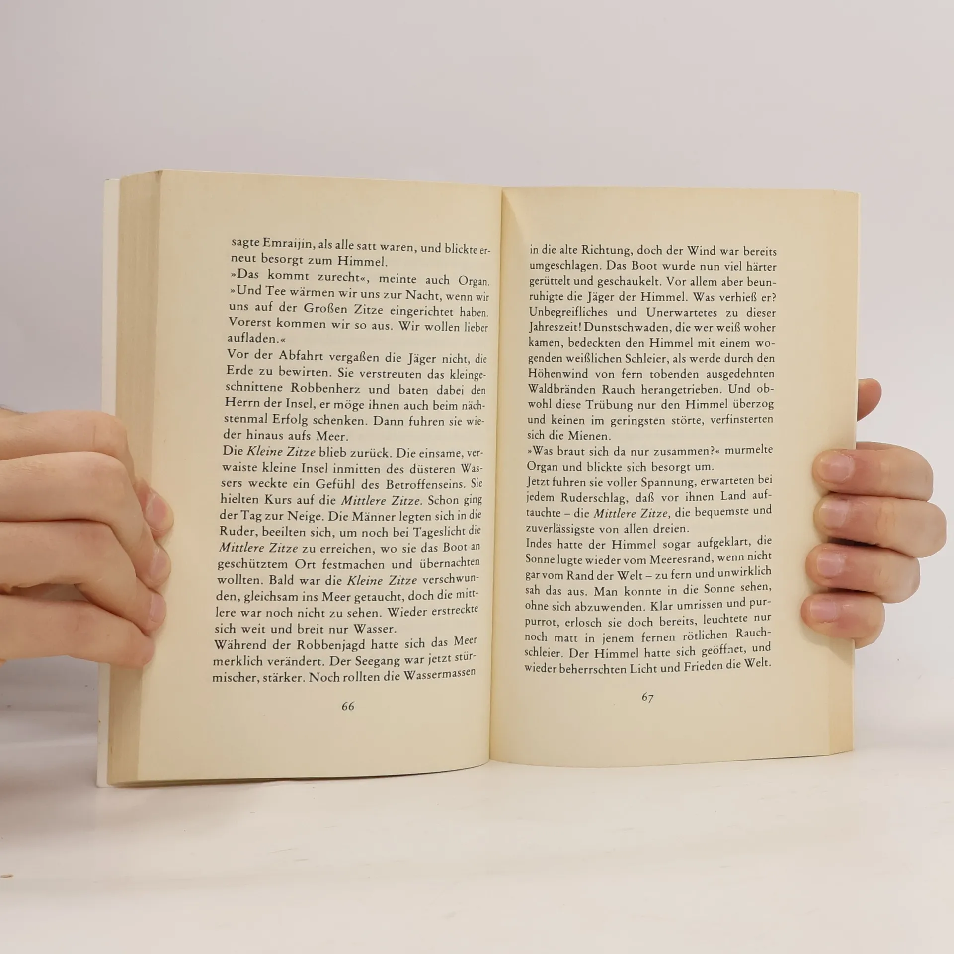 Drei Männer, der weise Organ sowie Emraijin und Mylgun, Vater und Onkel des elfjährigen Kirisk, die als die besten Jäger des Clans gelten, brechen mit dem Jungen im selbstgebauten Kajak zur Robbenjagd auf. Wie der alte Stammesbrauch es fordert, soll der Junge, der nun das Jägerhandwerk erlernen muß, mit dem Meer Freundschaft schließen, „damit das Meer ihn kennt und er selbst das Meer achtet“.