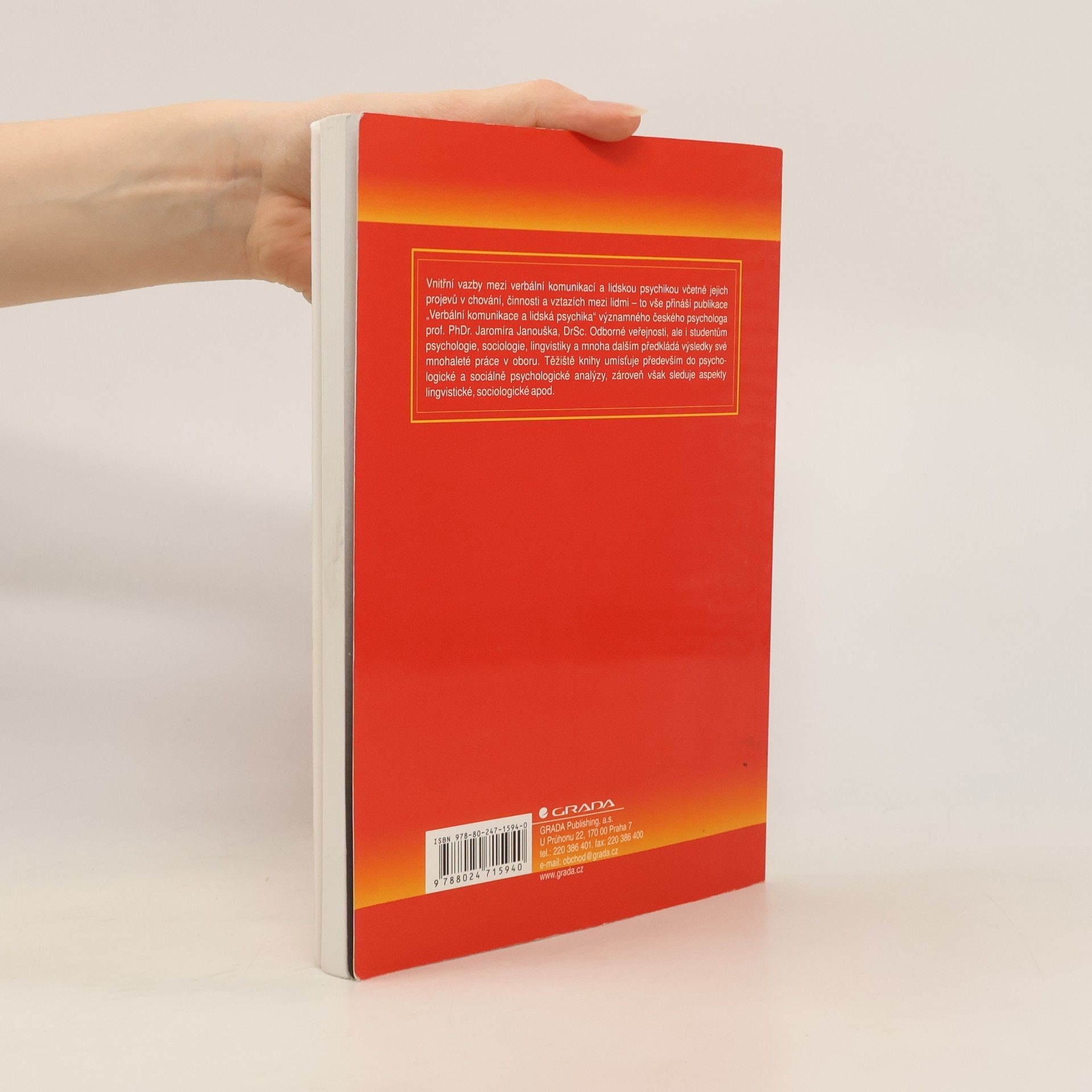 Vnitřní vazby mezi verbální komunikací a lidskou psychikou včetně jejich projevů v chování, činnosti a vztazích mezi lidmi - to vše přináší publikace "Verbální komunikace a lidská psychika" významného českého psychologa prof. Phdr. Jaromíra Janouška, DrSc. Odborné veřejnosti, ale i studentům psychologie, sociologie, lingvistiky a mnoha dalším předkládá výsledky své mnohaleté práce v oboru. Těžiště knihy umísťuje především do psychologické a sociálně psychologické analýzy, zároveň však sleduje aspekty lingvistické, sociologické apo
