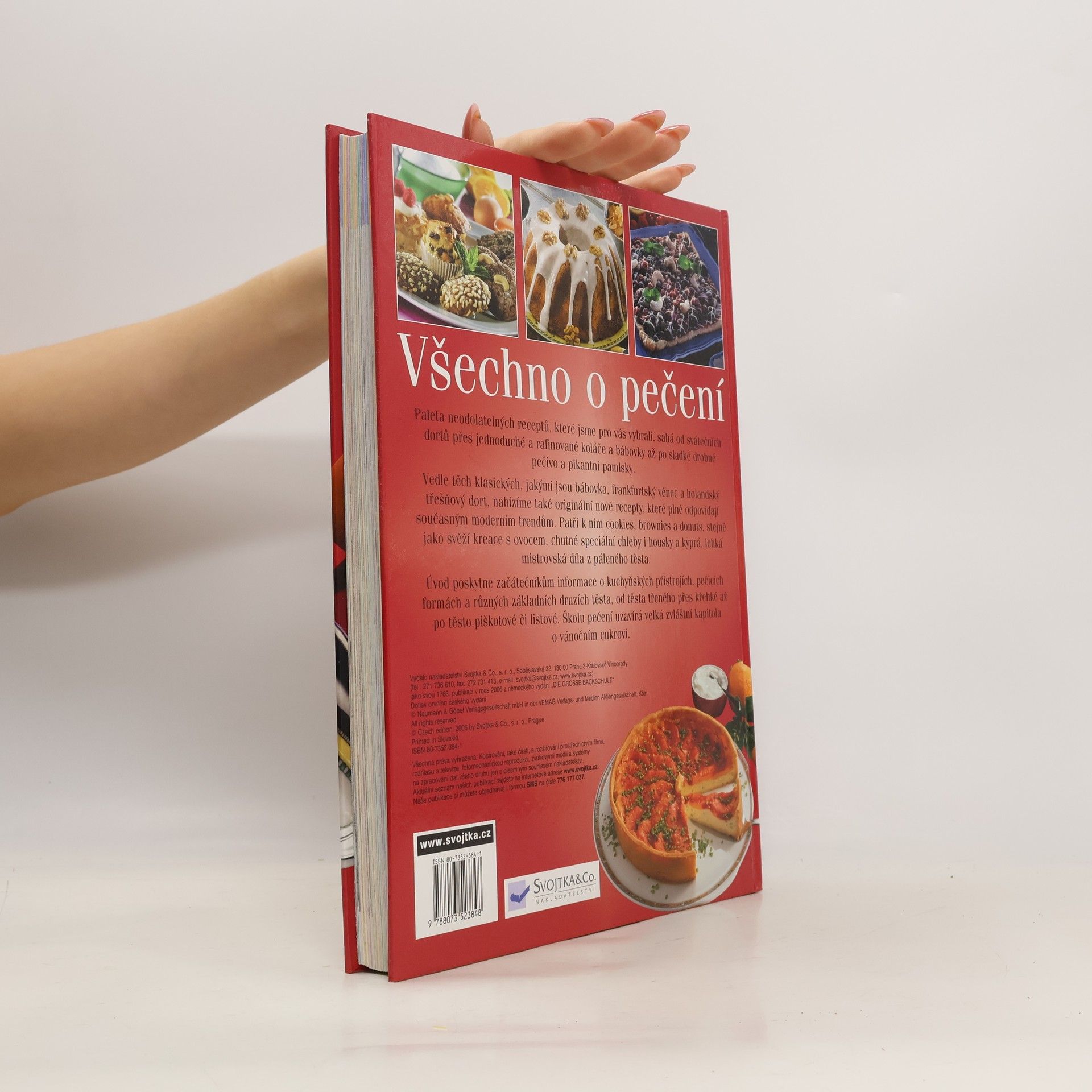Paleta neodolatelných receptů, které jsme pro vás vybrali, sahá od svátečních dortů přes jednoduché a rafinované koláče a bábovky až po sladké drobné pečivo a pikantní pamlsky. Vedle těch klasických, jakými jsou bábovka, frankfurtský věnec a holandský třešňový dort, nabízíme také originální nové recepty, které plně odpovídají současným moderním trendům. Patří k nim cookies, brownies a donuts, stejně jako svěží kreace s ovocem, chutné speciální chleby i housky a kyprá, lehká mistrovská díla z páleného těsta. Úvod poskytne začátečníkům informace o kuchyňských přístrojích, pečicích formách a různých základních druzích těsta, od těsta třeného přes křehké až po těsto piškotové či listové. Školu pečení uzavírá velká zvláštní kapitola o vánočním cukroví.